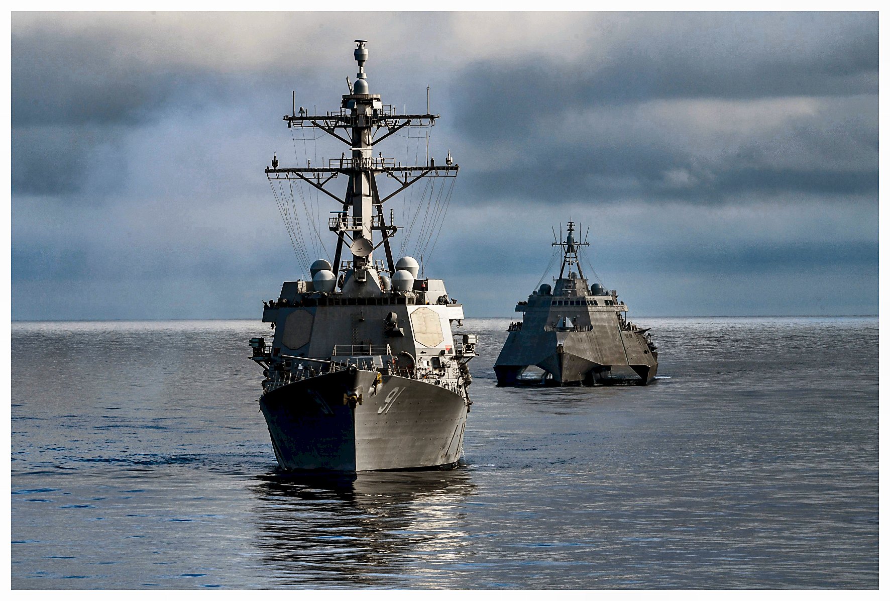 347k | 02 February 2020: the Pacific Ocean – The littoral combat ship USS Omaha (LCS 12) and the guided-missile destroyer USS Sterett (DDG 104) transit in