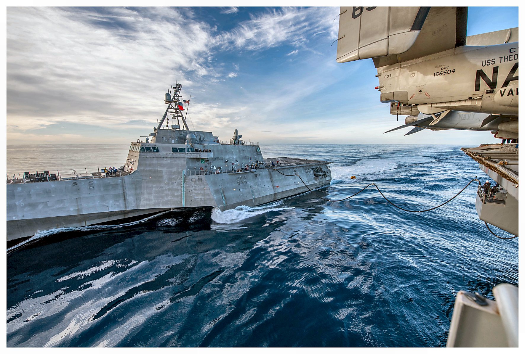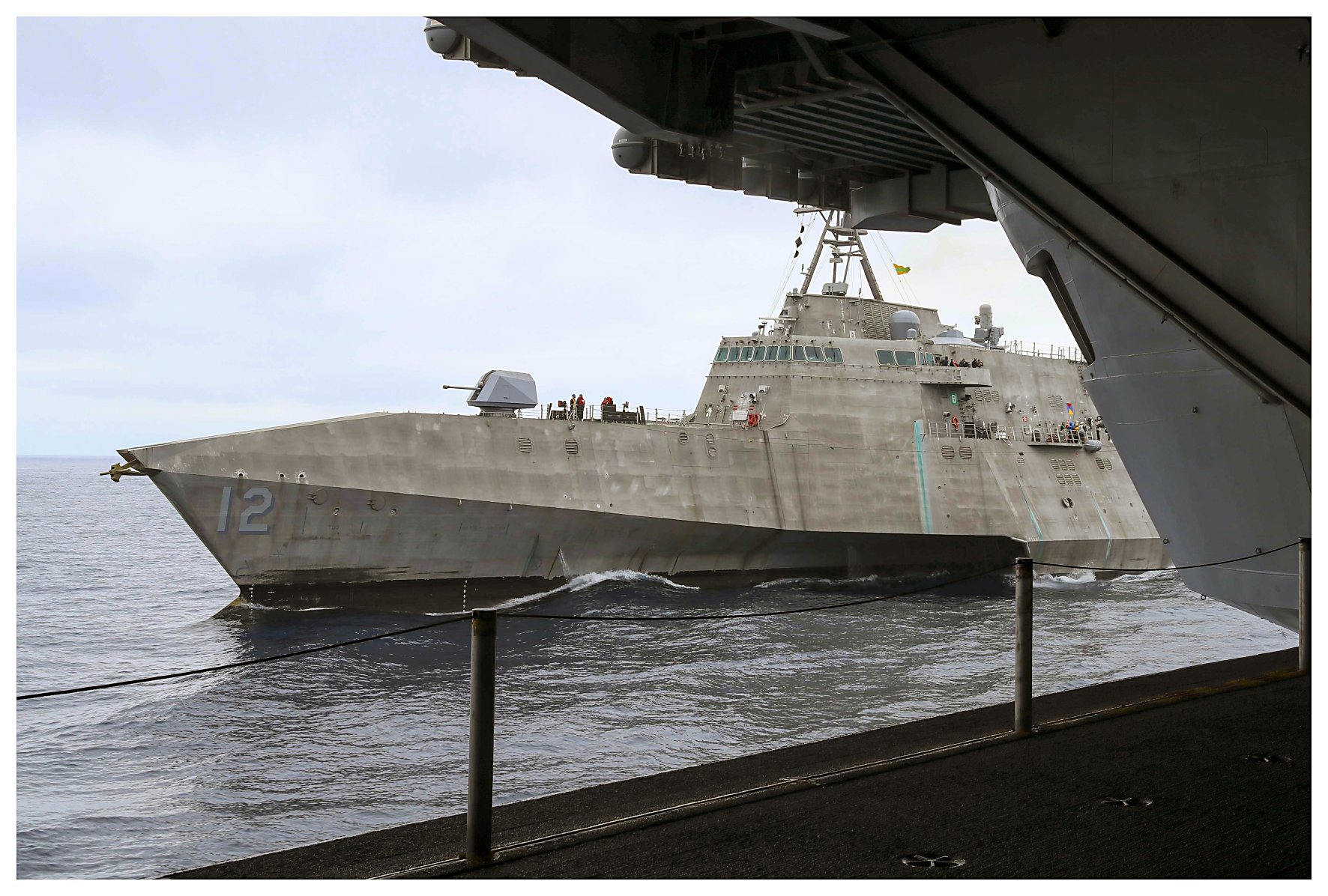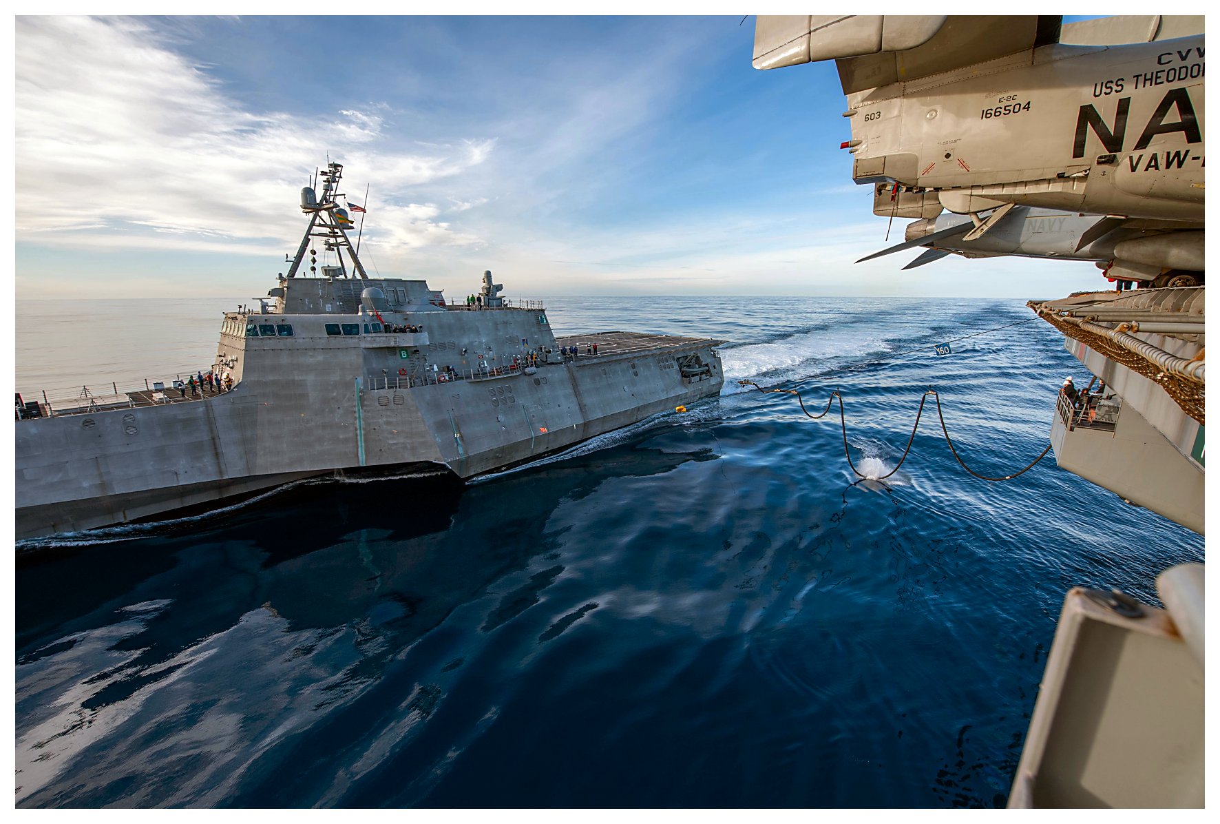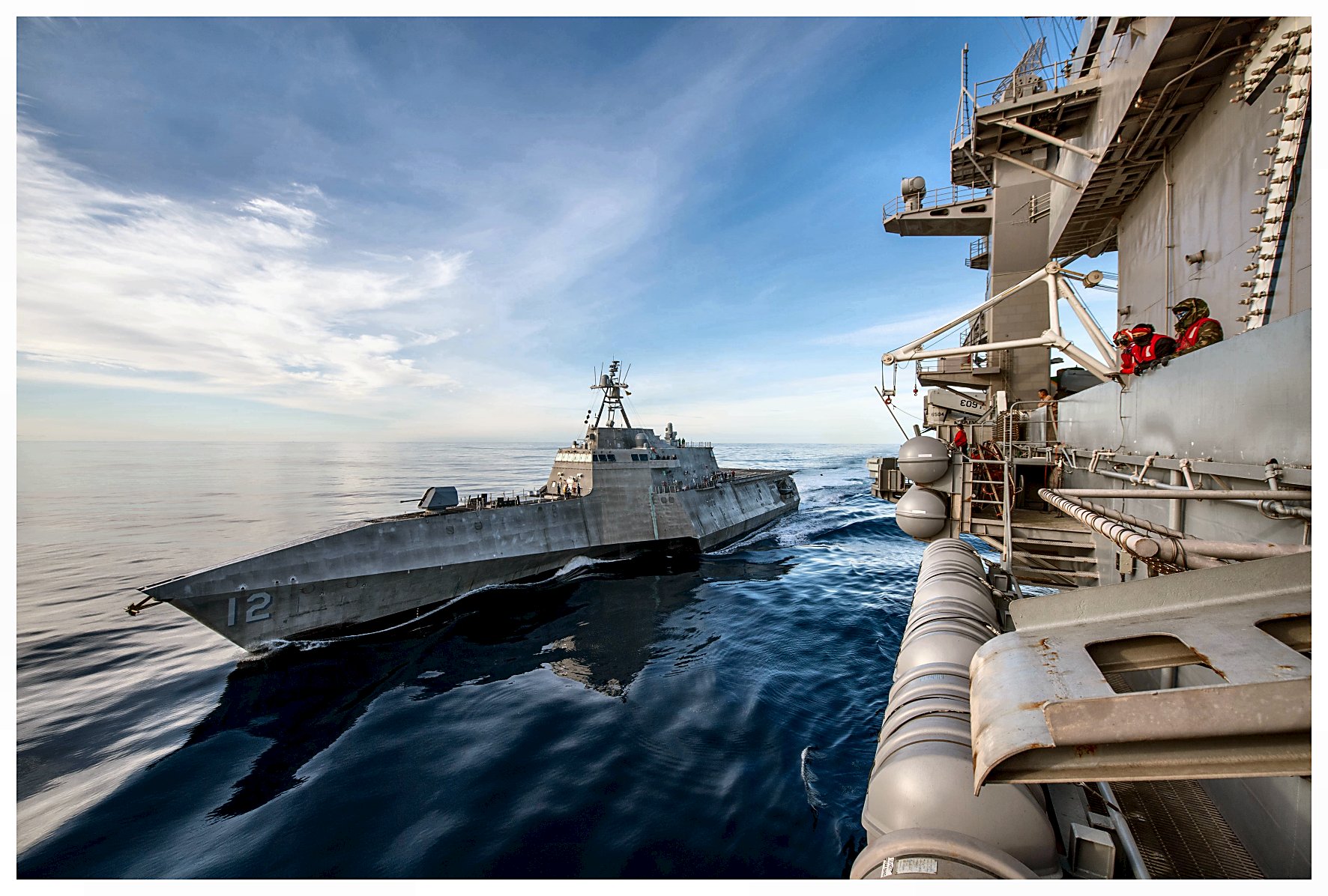 565k | 30 November 2019: the Pacific Ocean – The Independence-variant littoral combat ship USS Omaha (LCS 12) pulls alongside the aircraft carrier USS Theodore
