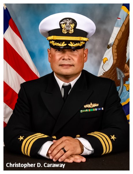 | 5.) 06 Aug. 2023 | Cmdr. Christopher D. Caraway (enl. '00, STA21 '06) (San Diego, Cal.) | 5.) 02 Apr. 2024 | Cmdr. Kevin P. Smith (NROTC ‘06) (Chicago, Ill.) | ||