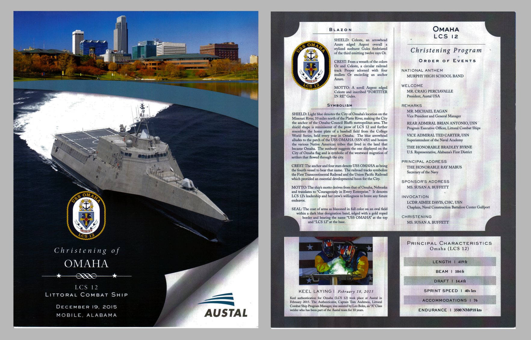 302k19 December 2015: Mobile, Ala. – An six view series of various items and activities from the christening of PCU Omaha (LCS 12). (© Photos courtesy of Austal USA) 1.) 1512008 2.) 1512009 3.) 1512010 4.) 1512011 5.) 1512012 5.) 1512013 |