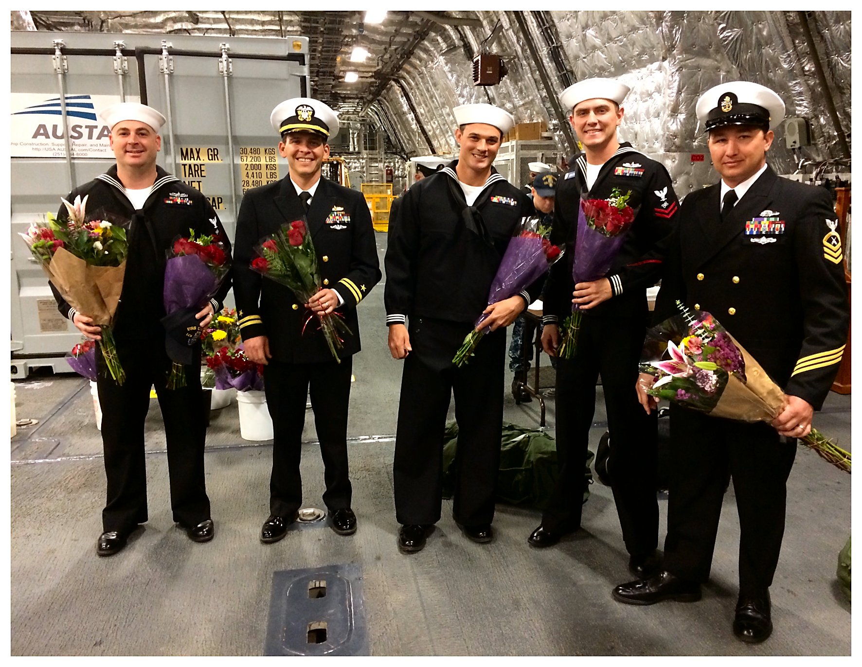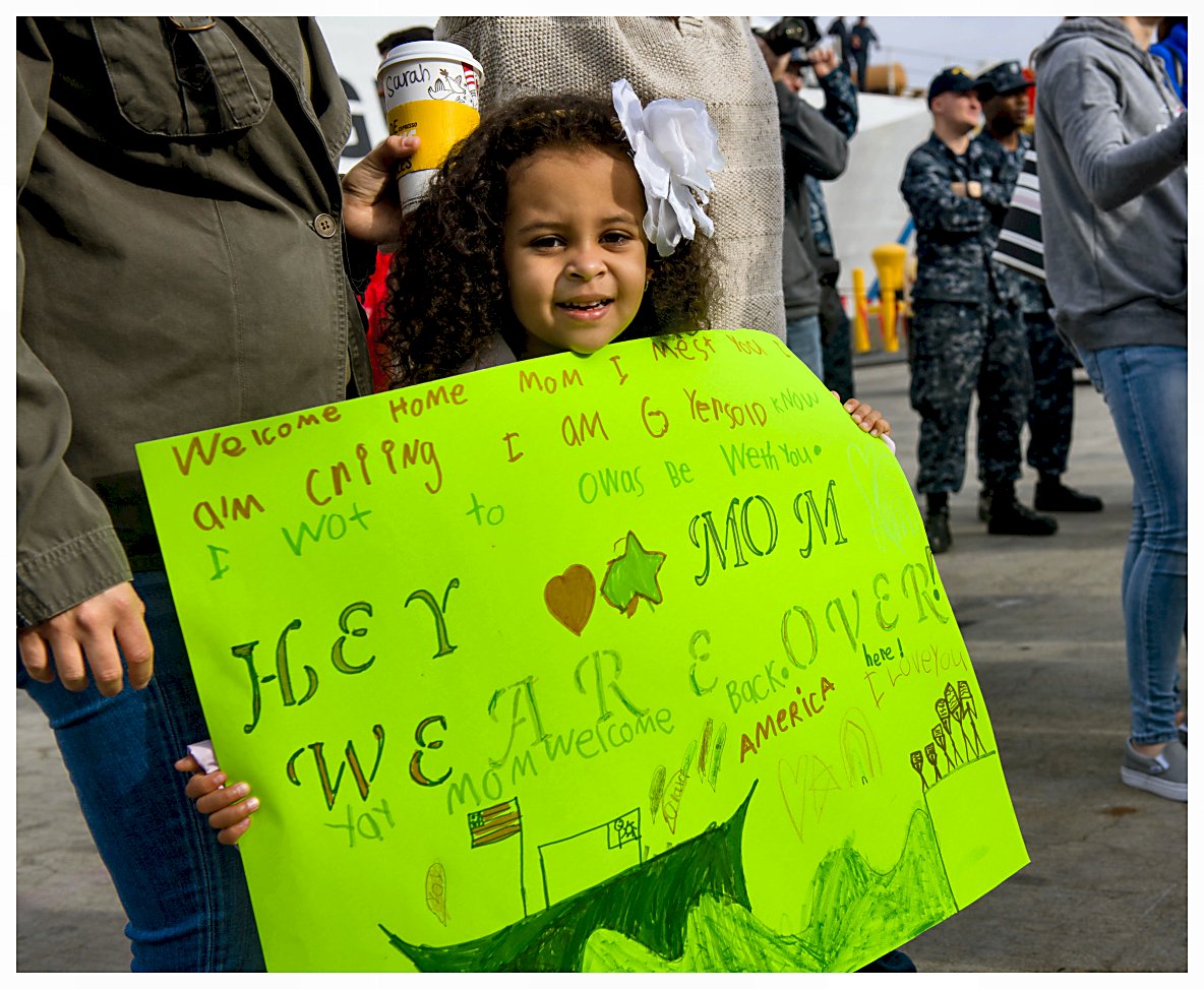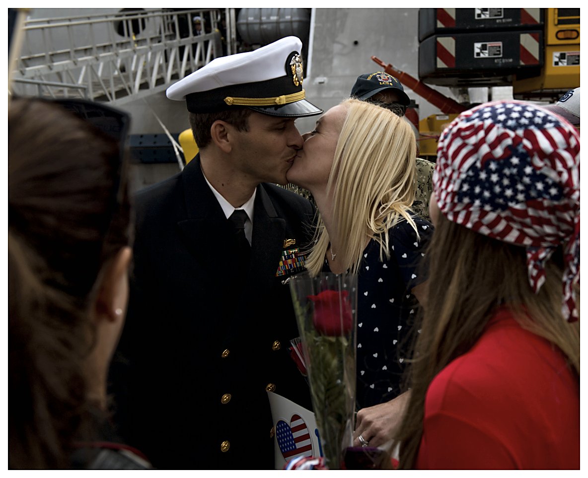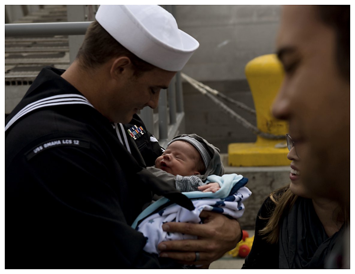 4.) 154k19 January 2019: San Diego, Cal. 1.) The daughter of a Sailor aboard the future USS Omaha holds a sign on the pier at Naval Base San Diego as she waits for the ship to arrive. 2.) Sailors assigned to the littoral combat ship the future USS Omaha wait to depart the ship as the ship arrives at its new homeport. 3.) Gunners Mate 1st Class Ryan Smith of the future USS Omaha holds his baby for the first time as the ship arrives at its new homeport. 4.) Lt. Dustin Crawford, combat systems officer aboard the future USS Omaha, kisses his wife Angie as the ship arrives at its new homeport. (U. S. Navy photos #1. 180119-N-NI420-0079, 2. 180119-N-BL450-471, 3. 180119-N-NI420-0185, and 4 180119-N-NI420-0190, by MC3 Molly DiServio from the Defense Visual Information Distribution Service) 1.) 1512p002 2.) 1512p003 3.) 1512p004 4.) 1512p005 | ||||