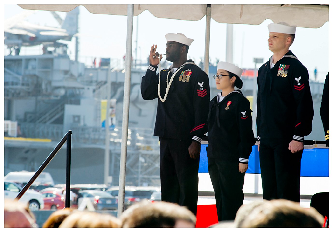 160k | 03 February 2018: San Diego, Cal. – Boatswain's Mate 1st Class Brendon Braveboy sounds the setting of the first watch during the commissioning ceremony of the littoral