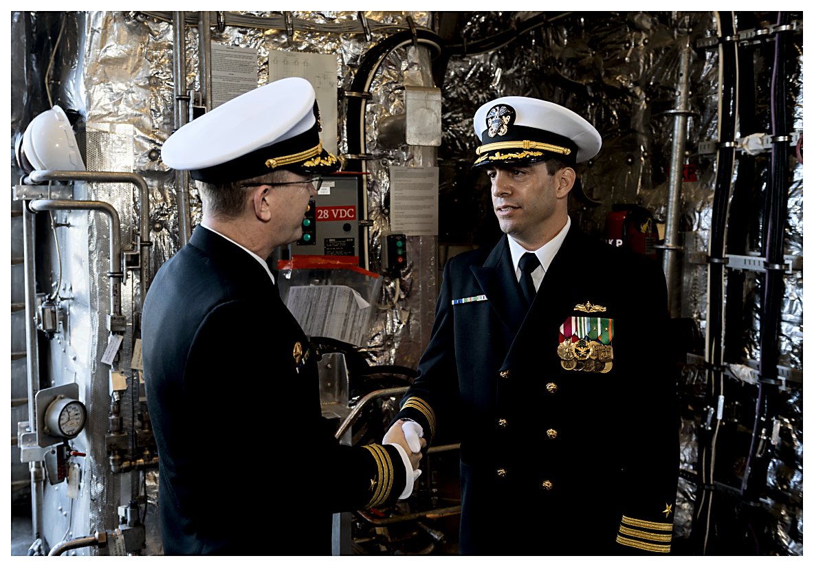 213k | 07 December 2018: San Diego, Cal. – Cmdr. John Barrientos and Cmdr. Michael Toth shake hands during a change of command ceremony held aboard the littoral combat ship USS