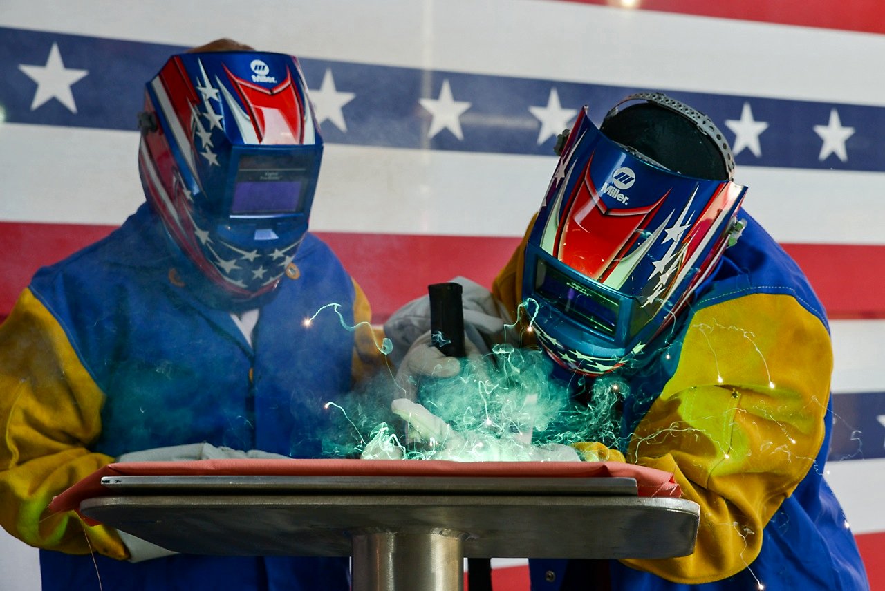 180k | 29 June 2015: Mobile, Ala. - New Hampshire Senator Jeanne Shaheen, ship's sponsor is aided by an Austal shipyard employee as she welds her initials into thee keel plate for the
