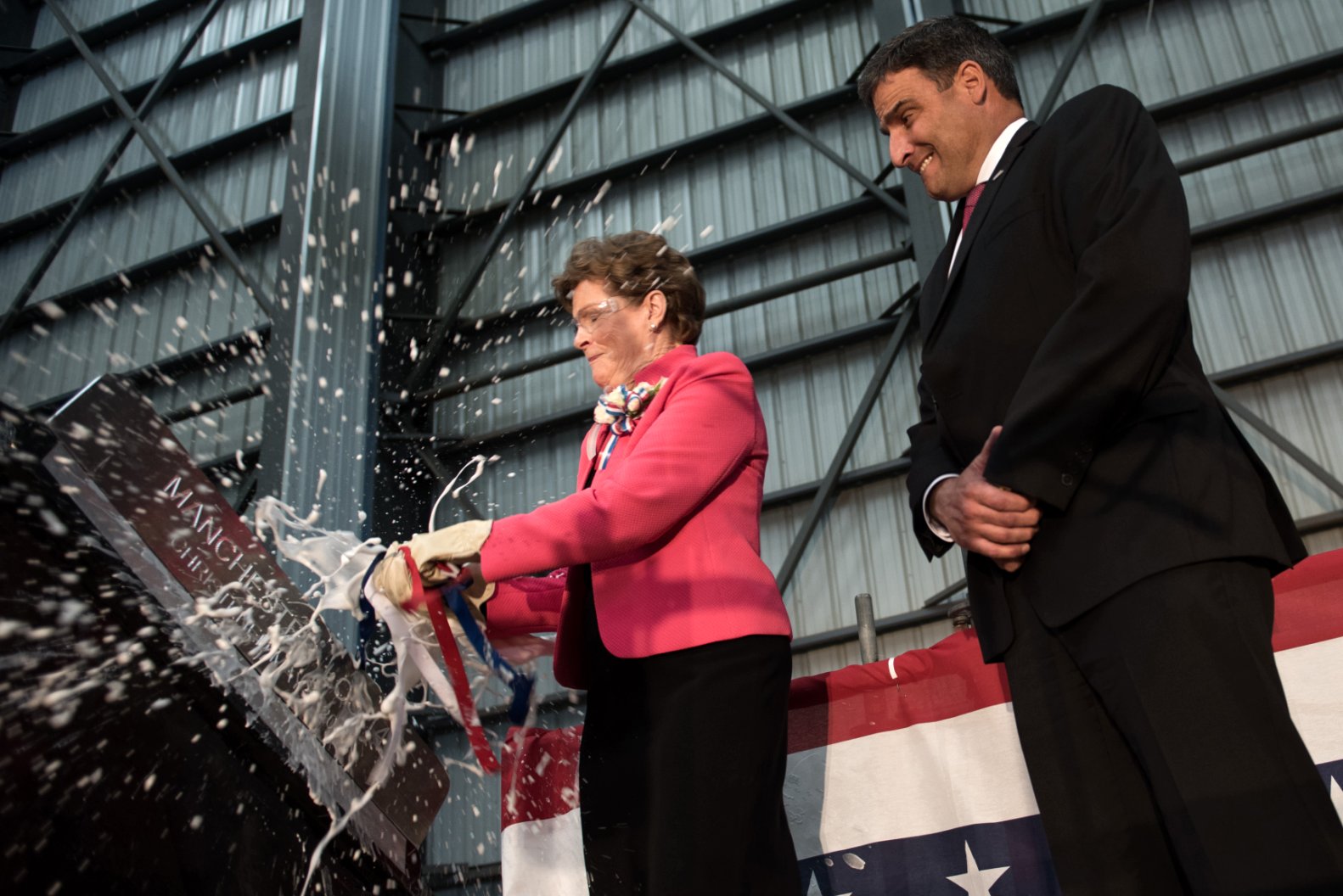 (LCS 14), breaks a bottle across the ship's bow during a christening ceremony. The Independence-variant littoral combat ship is named for the city of Manchester, New Hampshire. (U.S. Navy photo #160507-N-ZZ999-023 courtesy of Austal USA, from the Navy Newstand) | ||
