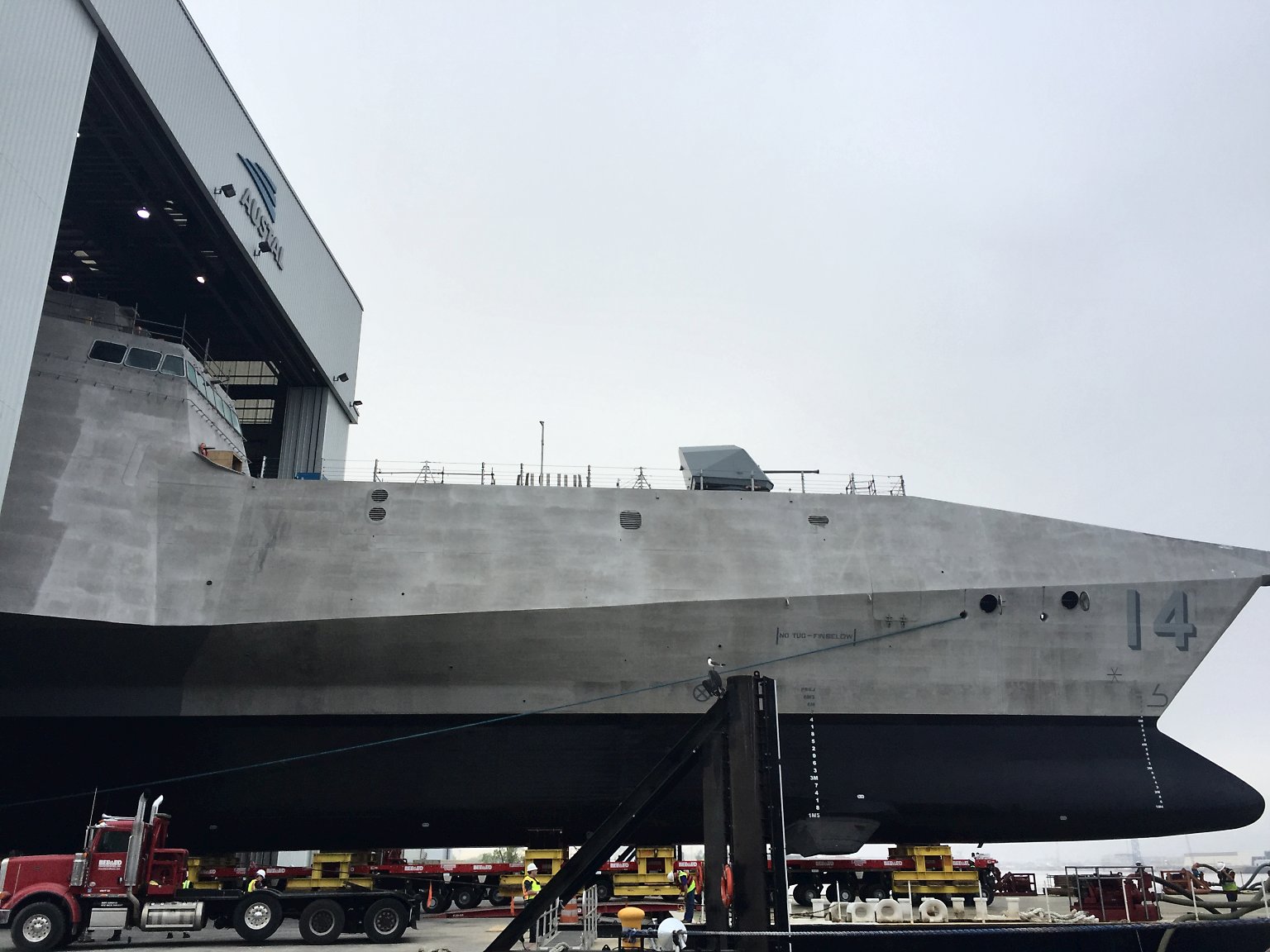 12 May 2016: A five view series of PCU Manchester (LCS 14) being rolled out of the Fabrication Shed at Austal to be placed on a barge and moved to BAE Systems further down the Mobile River. At BAE she'll be placed into a floating drydock for launching. The drydock will be flooded and Manchester will be floated out. (© Photos courtesy of Austal USA) 1514004 1514005 1514006 1514007 1514008 | ||||