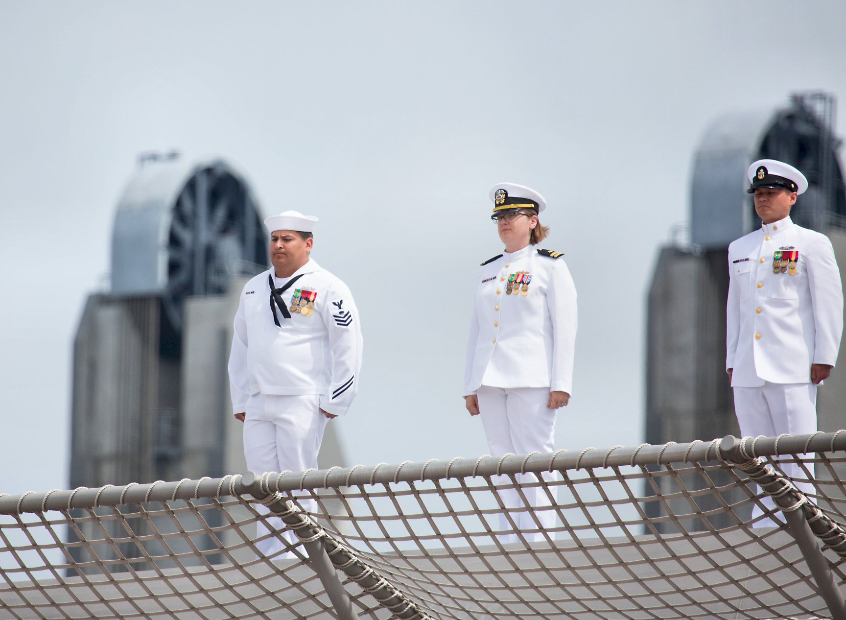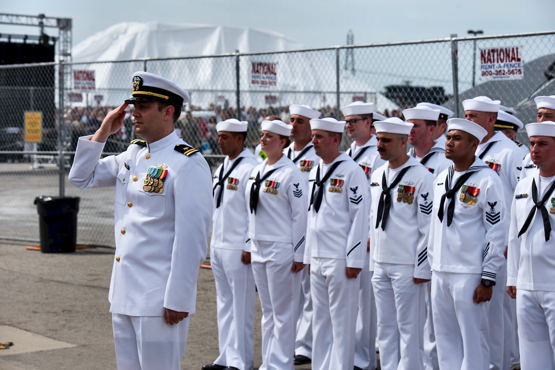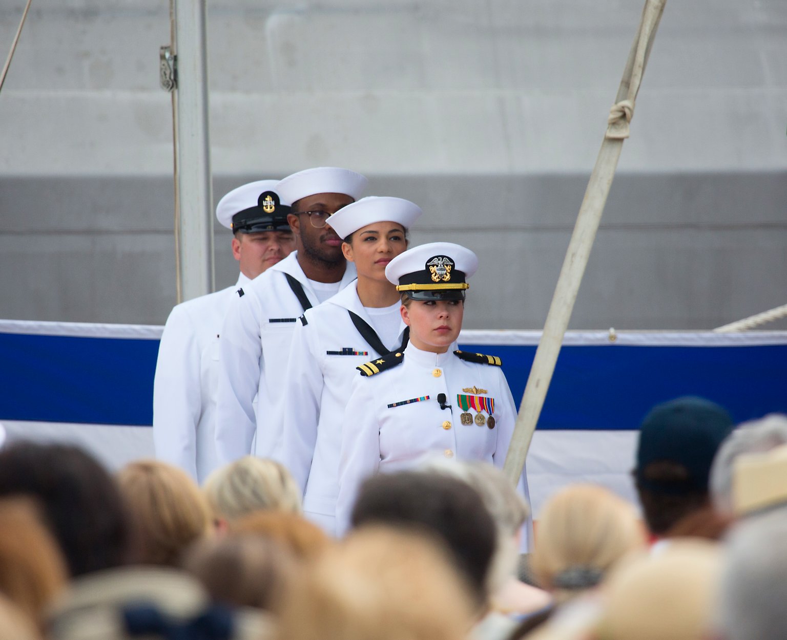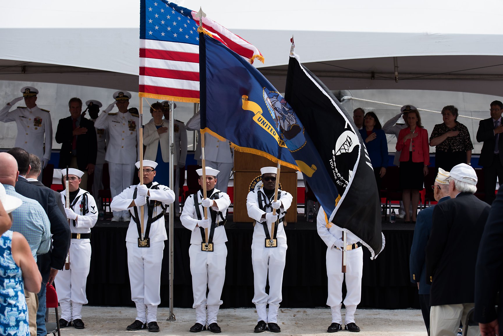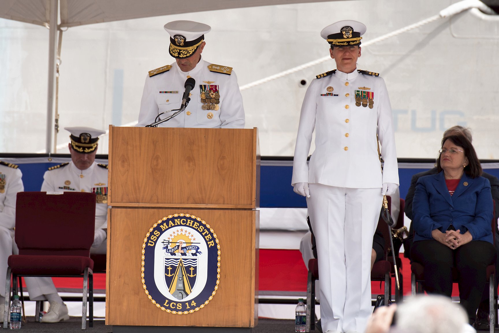 10.) 790k21 May 2018: Portsmouth, N.H. - A ten view series of USS Manchester (LCS 14) being commissioned at the New Hampshire State Pier in Portsmouth, N.H. 1.) The color guard of USS Manchester (LCS 14) parades the colors during the ship's commissioning ceremony. 2.) The crew of USS Manchester (LCS 14) render honors as the the national anthem is played during the ship's commissioning ceremony. 3.) USS Manchester's (LCS 14) sponsor, Sen. Jeanne Shaheen (D-NH), gives remarks during the commissioning ceremony of USS Manchester (LCS 14). 4.)* Vice CNO Admiral Bill Moran, left, commissions USS Manchester (LCS 14) with Commander Emily Basset, Manchester's commanding officer. 5.) Lt. Adrienne Penkacik, a Nashua, N.H. native, and the ship's first OOD, is presented the traditional long glass by New Hampshire resident John Costanzo. 6.) Lt. Adrienne Penkacik, front, leads the first watch team of Manchester (LCS 14) as they prepare to take the stage during the ship's commissioning ceremony. 7.) The crew of Manchester pass by applauding guests to board the ship after sponsor, Sen. Jeanne Shaheen gives the traditional order to 'man this ship and bring her to life.' 8.) The crew of USS Manchester quickly board the ship after the ship's sponsor, Sen. Jeanne Shaheen (D-NH), gives the traditional order to 'man this ship and bring her to life.' 9., 10.) The crew of Manchester man the rails during the ship's commissioning after the ship's sponsor, Sen. Jeanne Shaheen, gave the order to 'man this ship and bring her to life.' (U.S. Navy photos # 1. 180526-N-BT947-1110, 2. 180526-N-BT947-1137, 3. 180526-N-BT947-1287, 4. 180526-N-BT947-1400*, 5. 180526-N-BT947-1490, 6. 180526-N-BT947-1563, 7. 180526-N-BT947-1536, 8. 180526-N-BT947-1536, 9. 180526-N-BT947-1536, 10. 180526-N-BT947-1583 by MC2 Jacob I. Allison and AG1 Angela K. Koob* from the Defense Visual Information Distribution Service) 1.) 1514025 2.) 1514026 3.) 1514027 4.) 1514028 5.) 1514029 6.) 1514030 7.) 1514031 8.) 1514032 9.) 1514033 10.) 1514034 |