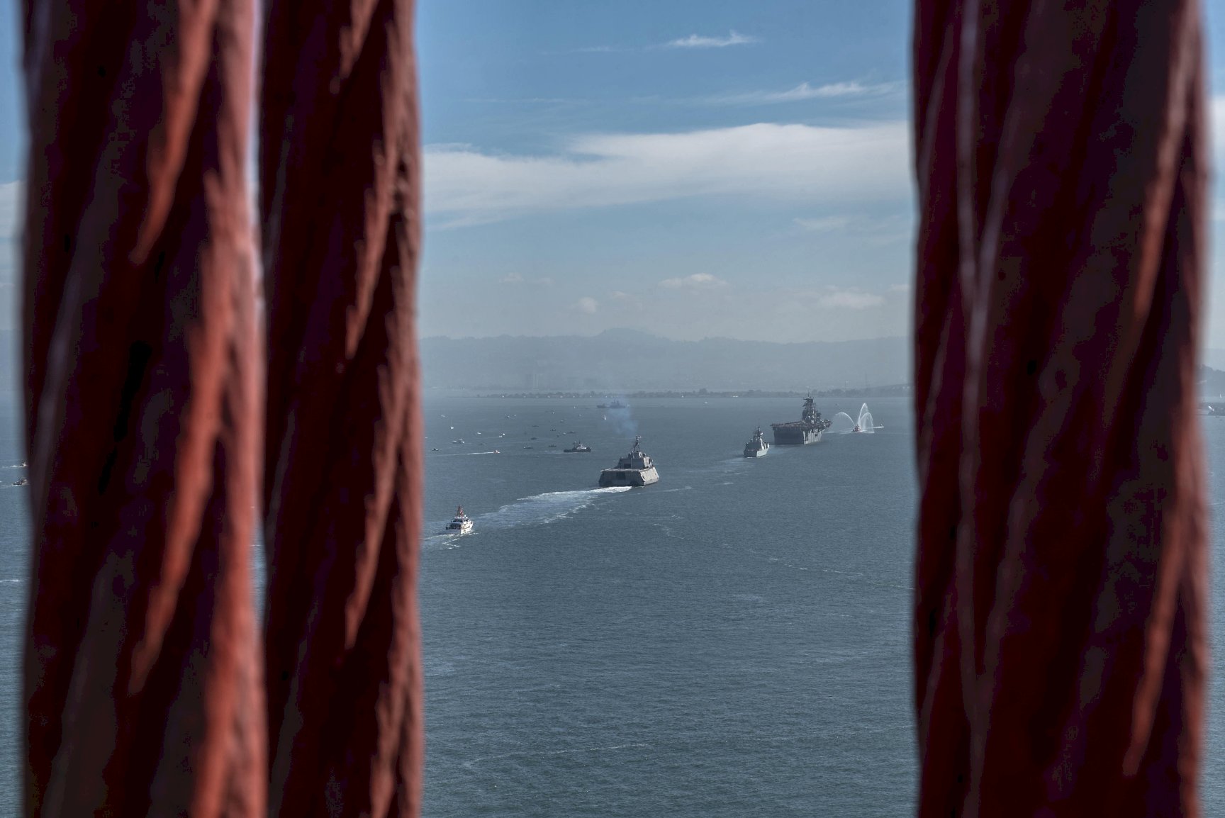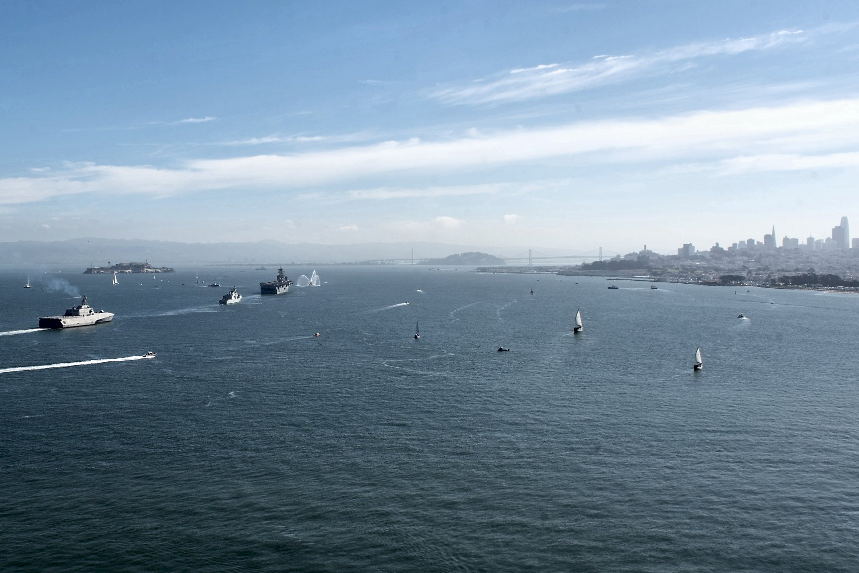 Friday, 05 October 2018: San Francisco, Cal. - The littoral combat ship USS Manchester (LCS 14), front left, the Royal Canadian Navy frigate HMCS Vancouver (FFH 331) and the amphibious assault ship USS Bonhomme Richard (LHD 6) entering and transitting San Francisco Bay to sail in the Parade of Ships during San Francisco Fleet Week 2018. San Francisco Fleet Week is an opportunity for the American public to meet their Navy, Marine Corps and Coast Guard teams and experience America's sea services. During fleet week, service members participate in various community service events, showcase capabilities and equipment to the community, and enjoy the hospitality of San Francisco and its surrounding areas. (U.S. Navy photos #181005-N-ZO368-007 by MC1 Travis S. Alston, #181005-N-FF029-1127 and 181005-N-FF029-1112 by MC3 Daniel Charest, #181005-N-GZ228-075 by MC2 Jesse Monford, 181005-N-ZO368-009 by MC1 Travis S. Alston from the Navy Newstand) 1514041 1514042 1514043 1514044 1514045 | ||||