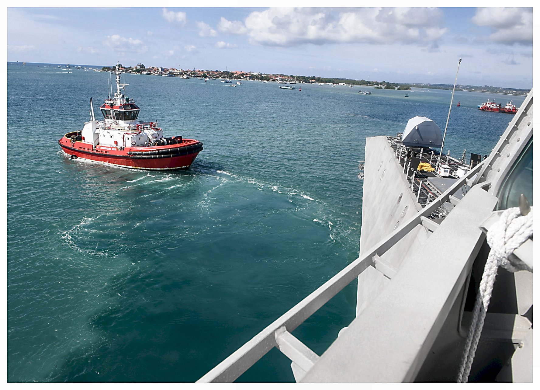 416k | 03 June 2023: Bali, Indonesia - Indonesian ship, KT Jayanegara 302, guides USS Manchester (LCS 14), into the harbor. Littoral