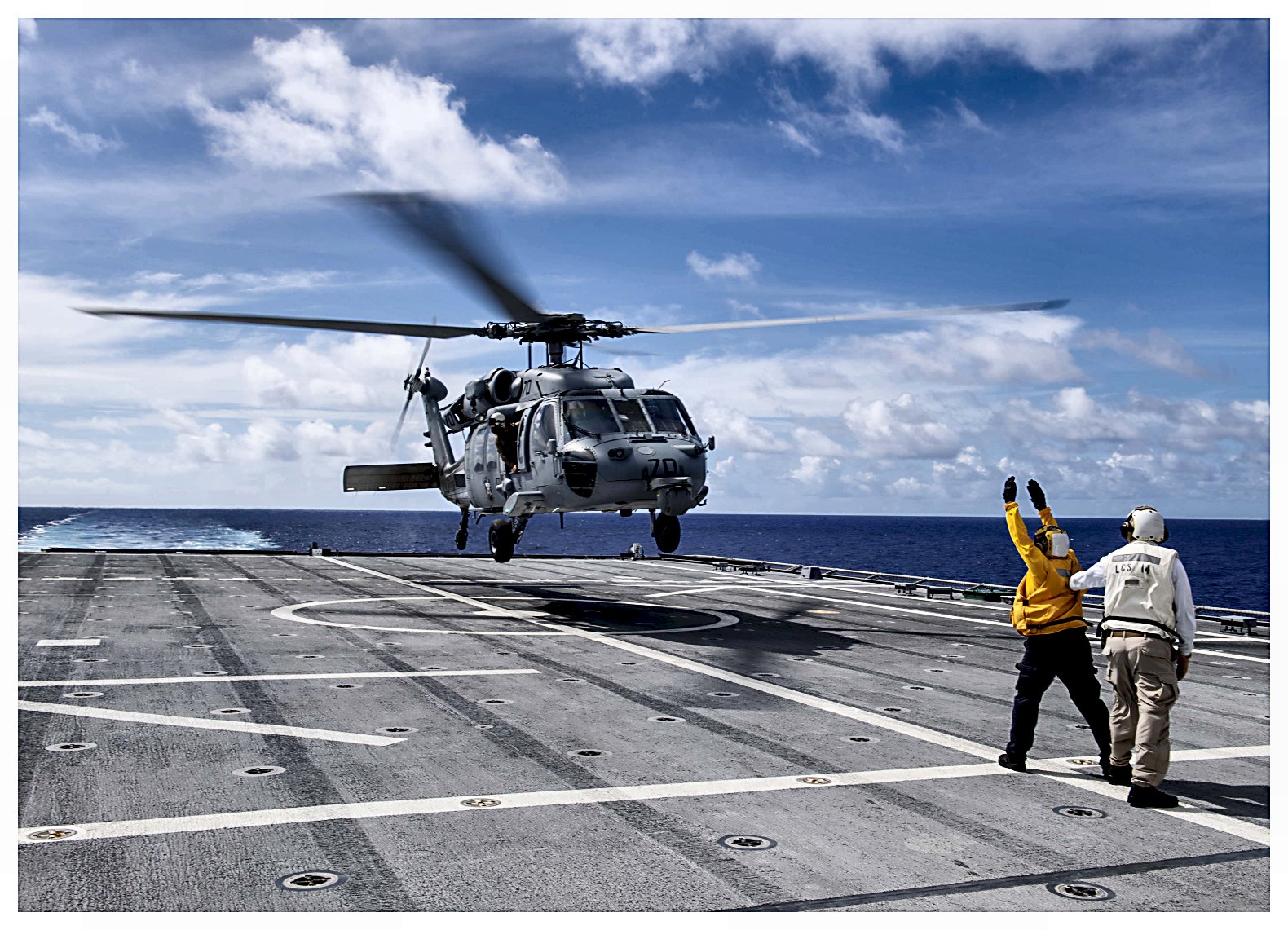460k | 23 June 2023: the Philippine Sea – Sailors, assigned to USS Manchester (LCS 14), refuel a MH60S on the ship’s flight deck during Exercise Pacific