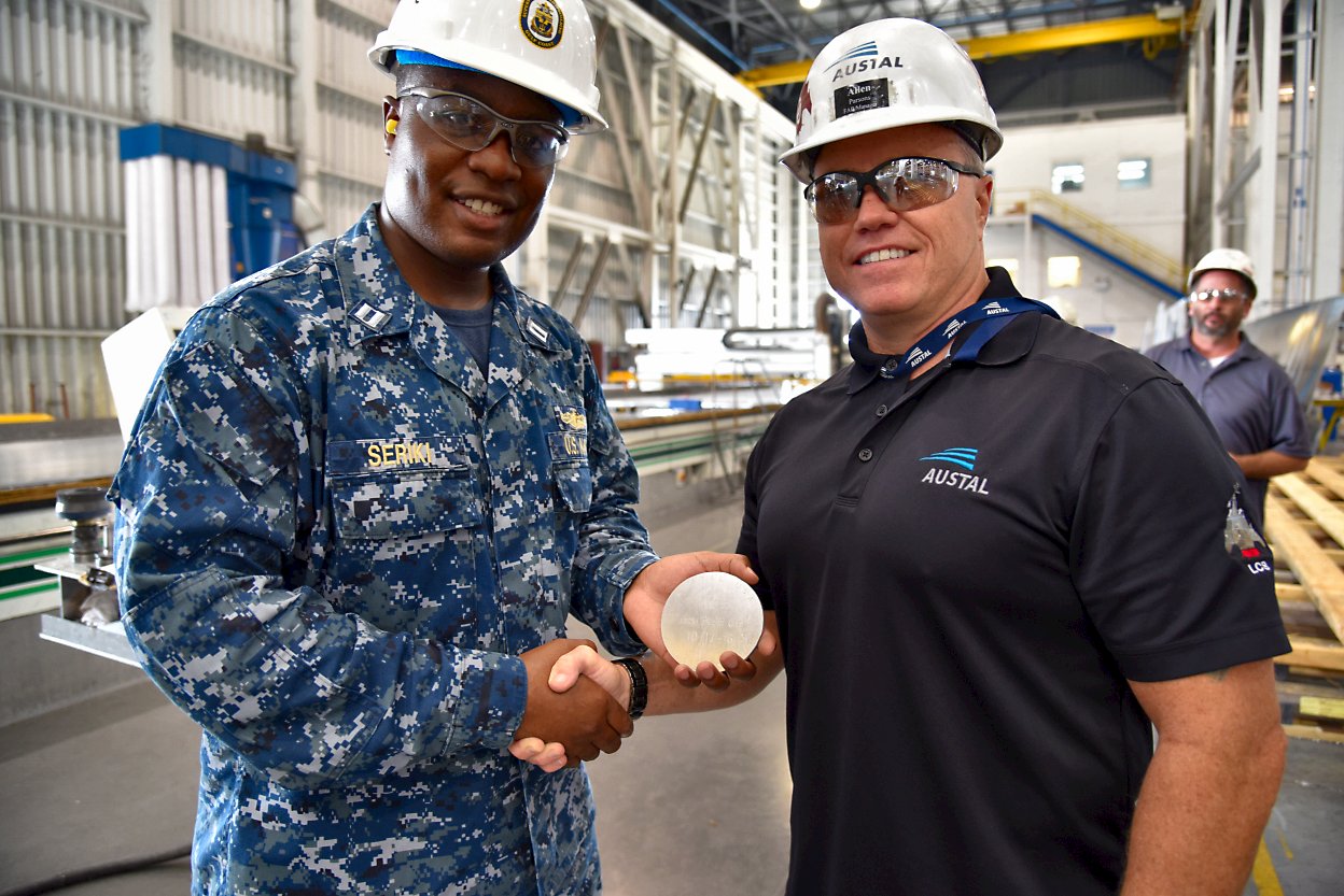 326k16 October 2016: Mobile, Ala. - The laying of a ship's keel usually signifies the begining of construction, but since the LCS is built in modular form, construction begins long before the official keel laying of the ship. Personnel from the U.S. Navy and Austal USA shipbuilding start the computerized machinery to cut the first sheet of aluminum that will be used in Kansas City's construction. After the ceremony each participant is given an engraved aluminum disk to commemorate the occasion. (© Photos courtesy of Austal USA) 15022002 15022003 15022004 15022005 | ||||