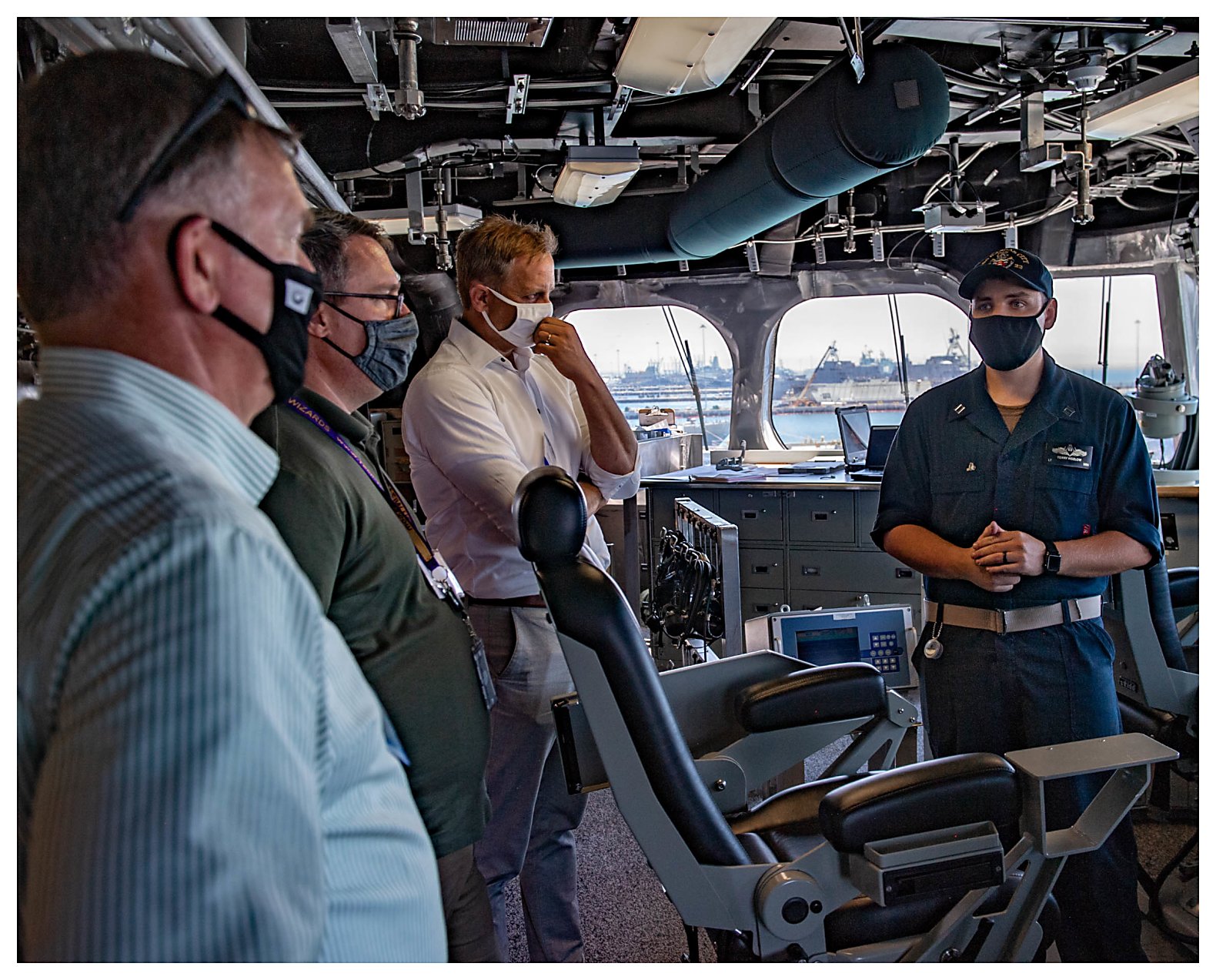 397k | 26 August 2021: San Diego, Cal. - Lt. Terry Kozlow gives a brief overview of what goes on in the bridge of a U.S. Navy ship during a tour aboard the Independence-class