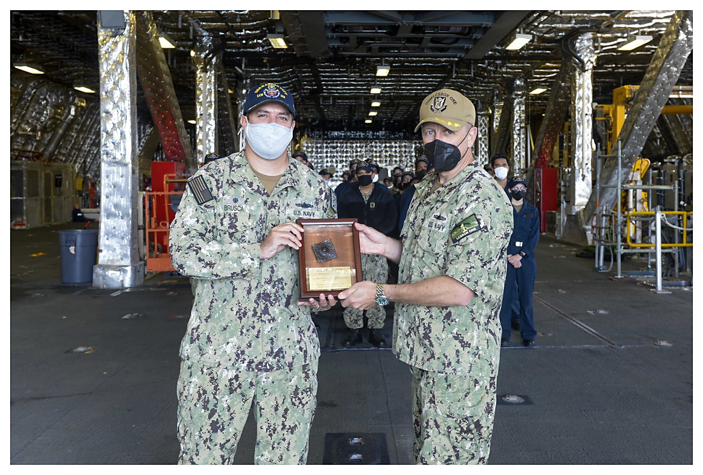 337k | 26 October 2021: San Diego, Cal. - Captain Jack Fay, Commodore of Commander, Littoral Combat Ship Squadron (COMLCSRON) ONE, presents a relic from USS Arizona