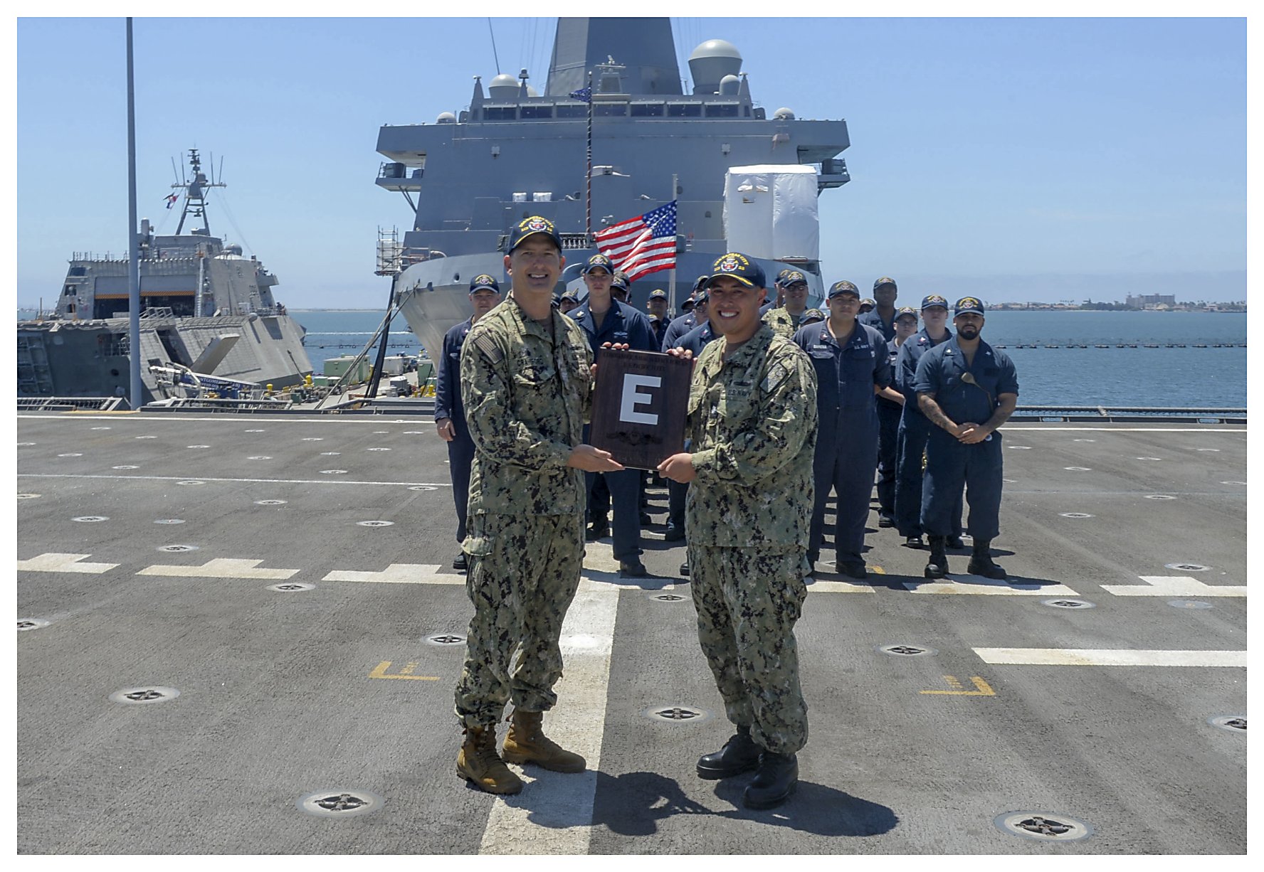 Wayne Gehman, the commanding officer, and then congratulates the sailors aboard USS Kansas City. The “Battle E” award recognizes crews with high levels of sustained proficiency