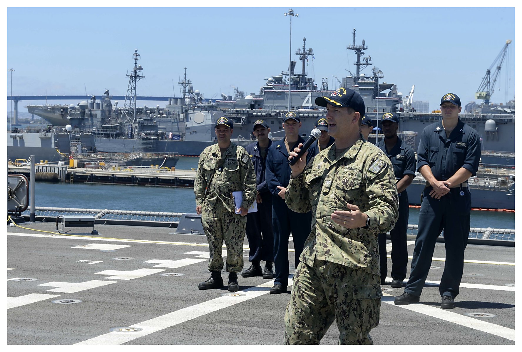 387k | 02 August 2022: San Diego, Cal. - Captain Marc Crawford, left, commodore of Littoral Combat Ship Squadron ONE, presents the Battle Efficiency Award to Commander