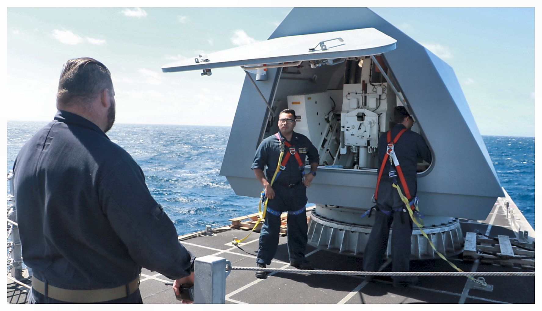 Joshua Rodriguez (center) and Gunner’s Mate Second Class Luis Cabrera conduct pre-firing maintenance on USS Kansas City’s (LCS 22) 57-mm Mark 110 Naval Gun System during Littoral