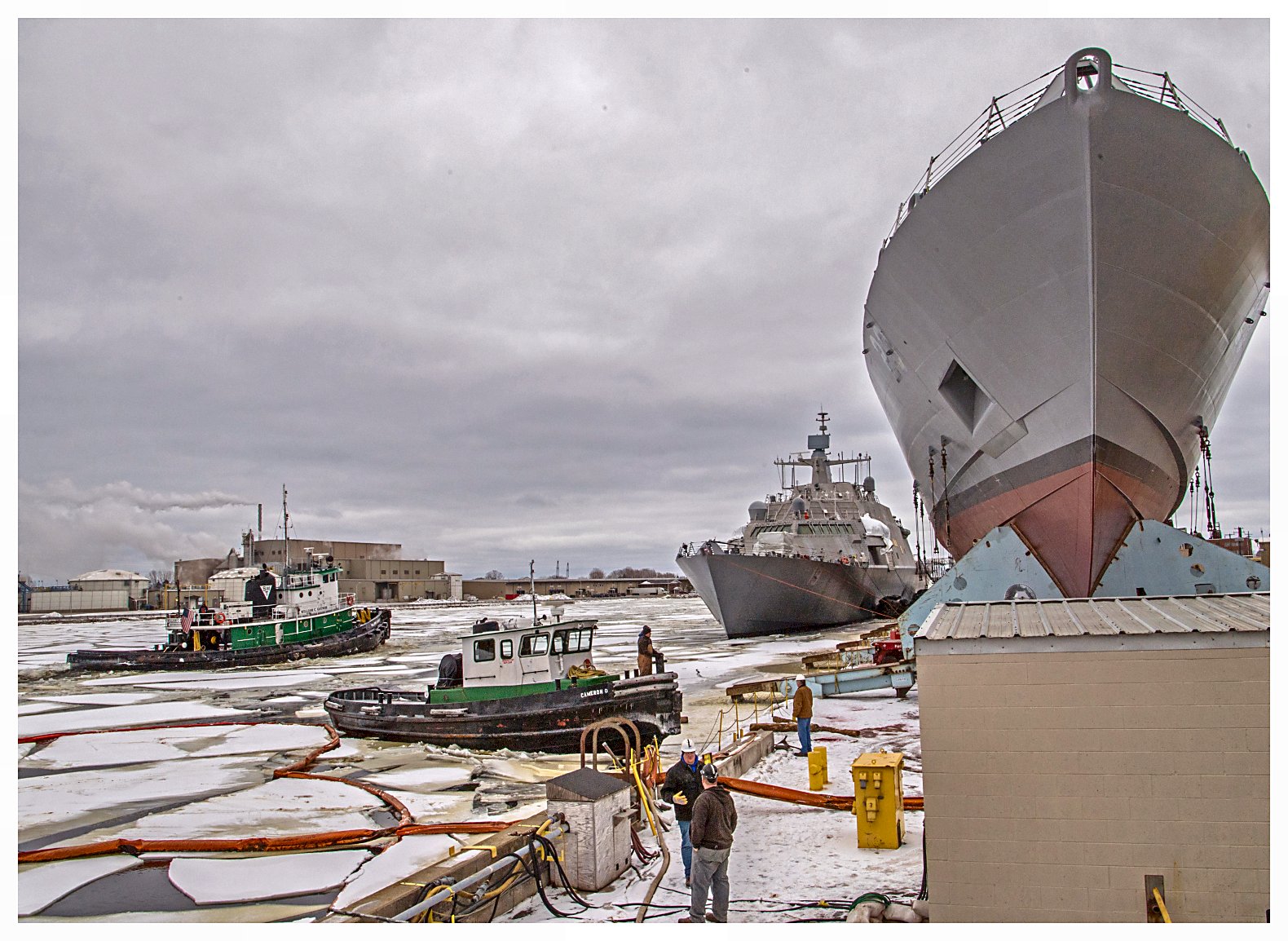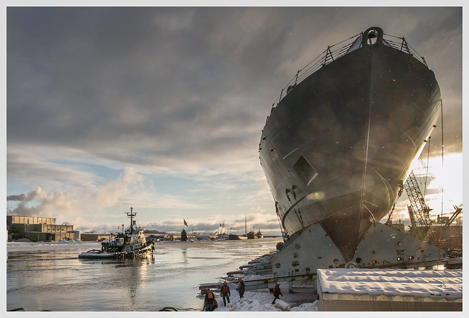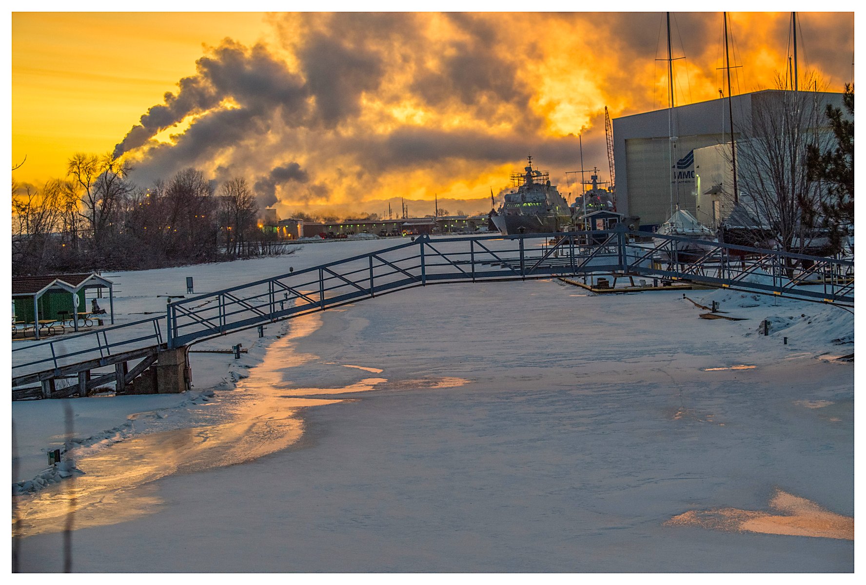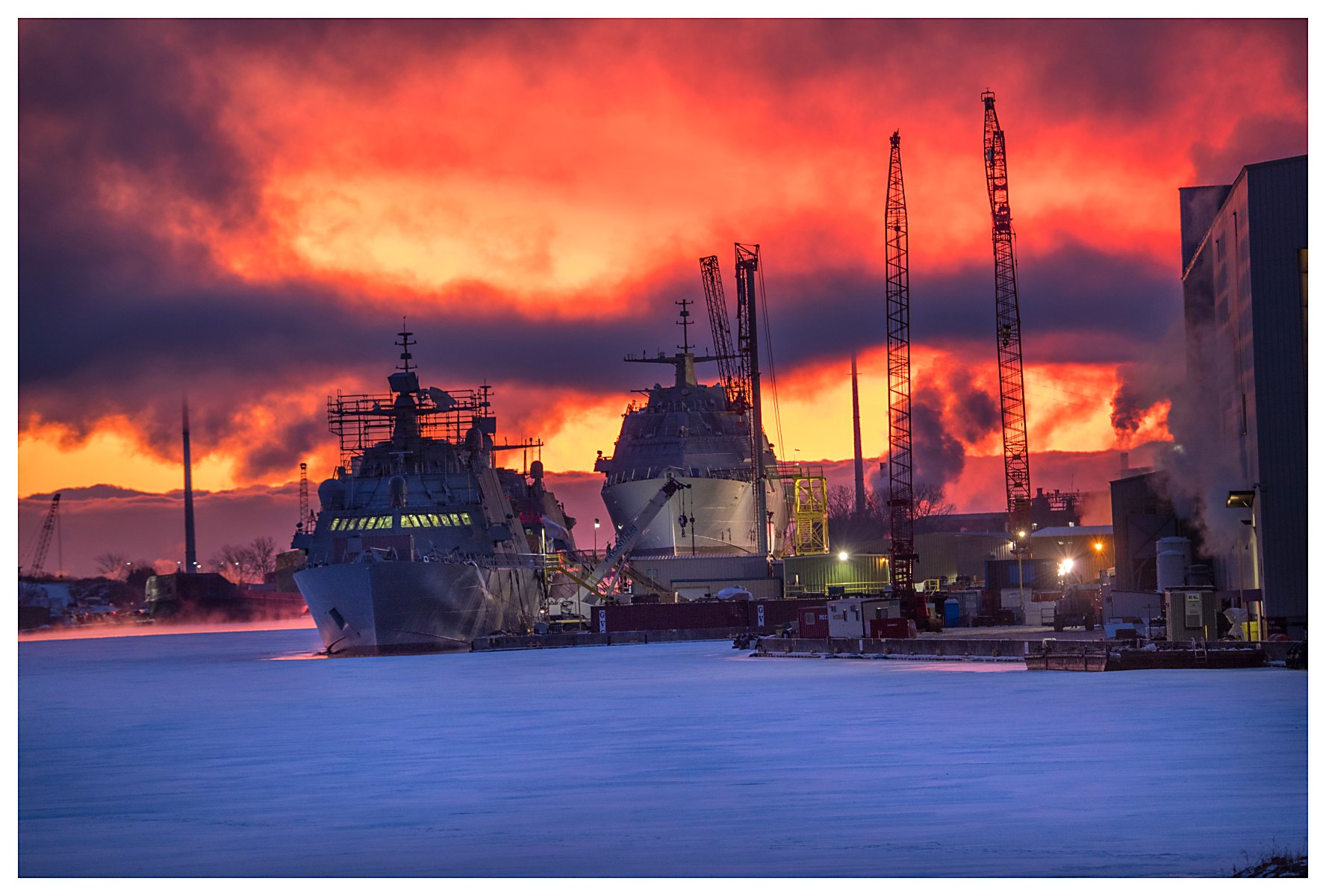 413k | 17 January 2020: Marinette, Wis. - Two views of a gorgeous winter morning at Fincantieri Marinette Marine, on the south bank of the Menominee River in Marinette,