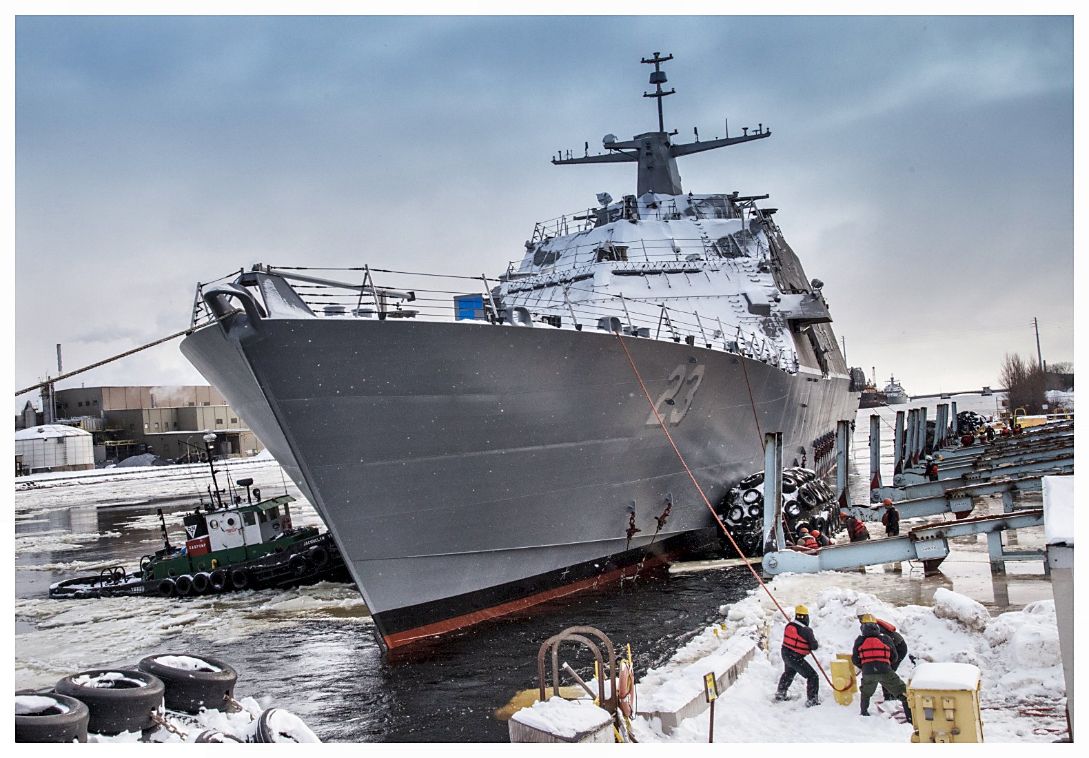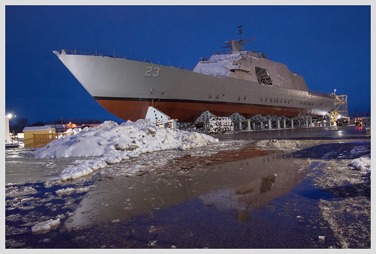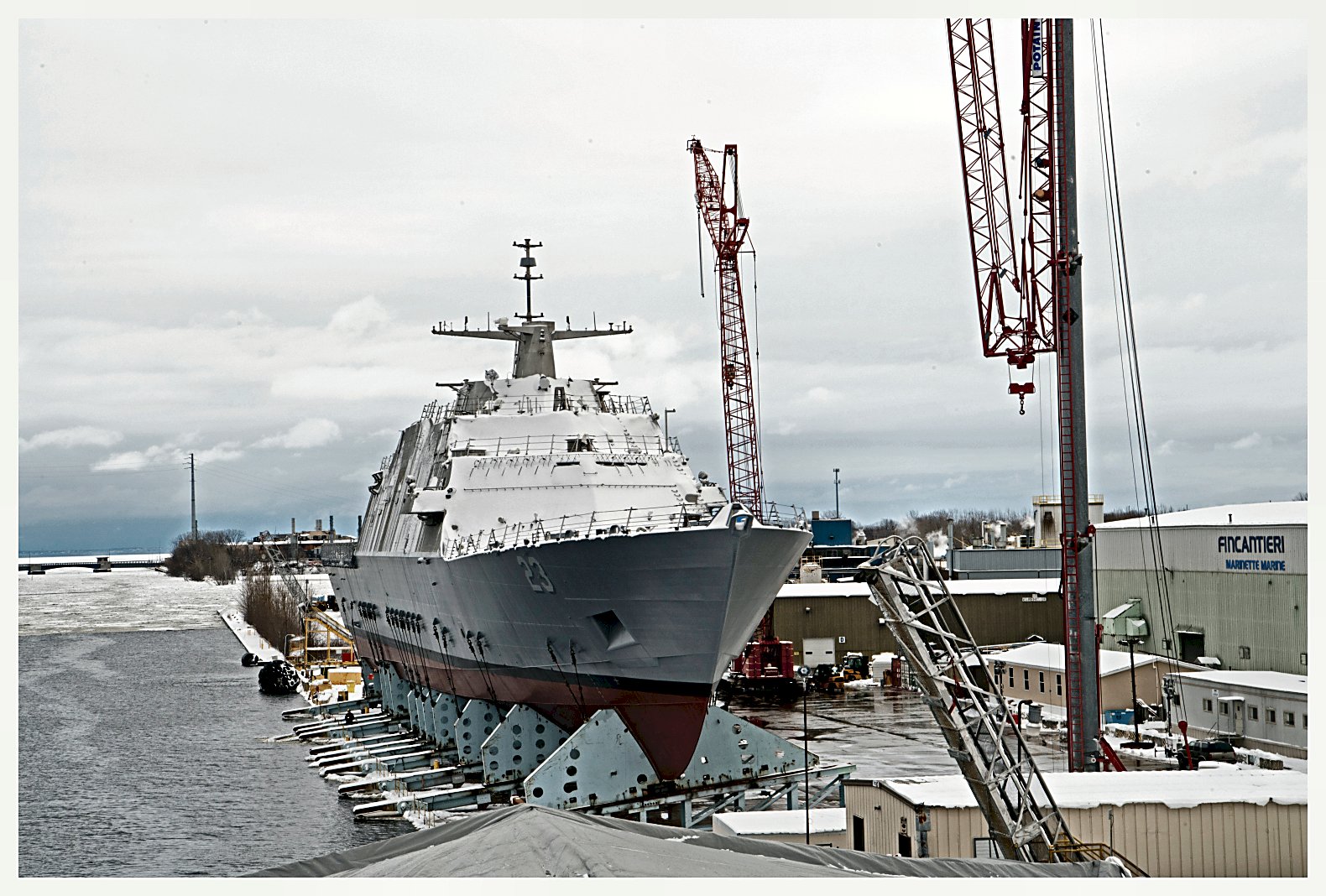 Wisconsin. The future USS Cooperstown (LCS 23) is in the launch cradle being prepared for her launch in two days, on 19 January. (Photo courtesy of Lockheed Martin, Fincantiere Marinette Marine) | ||
