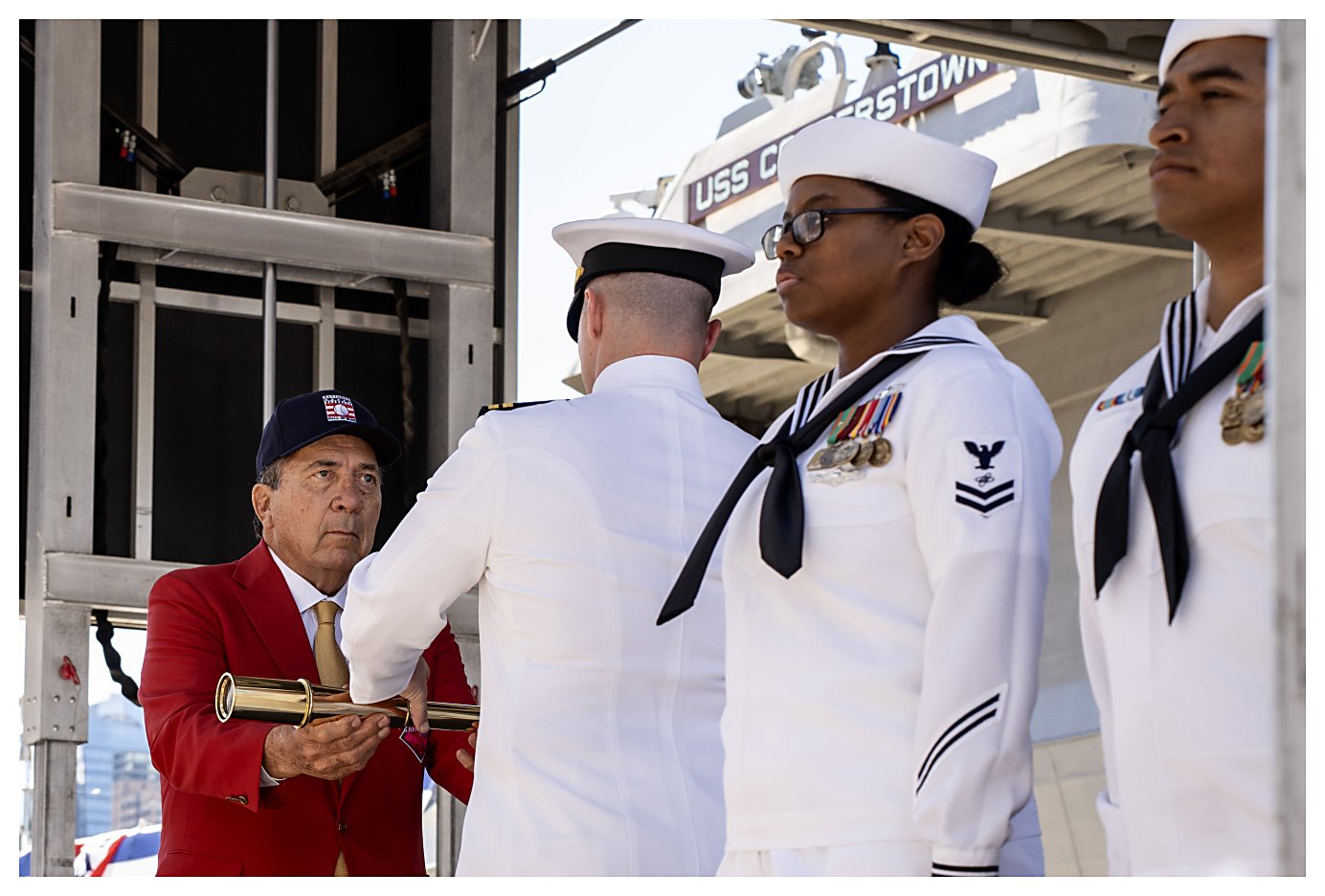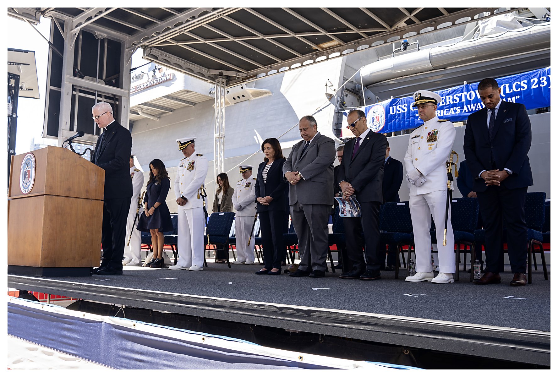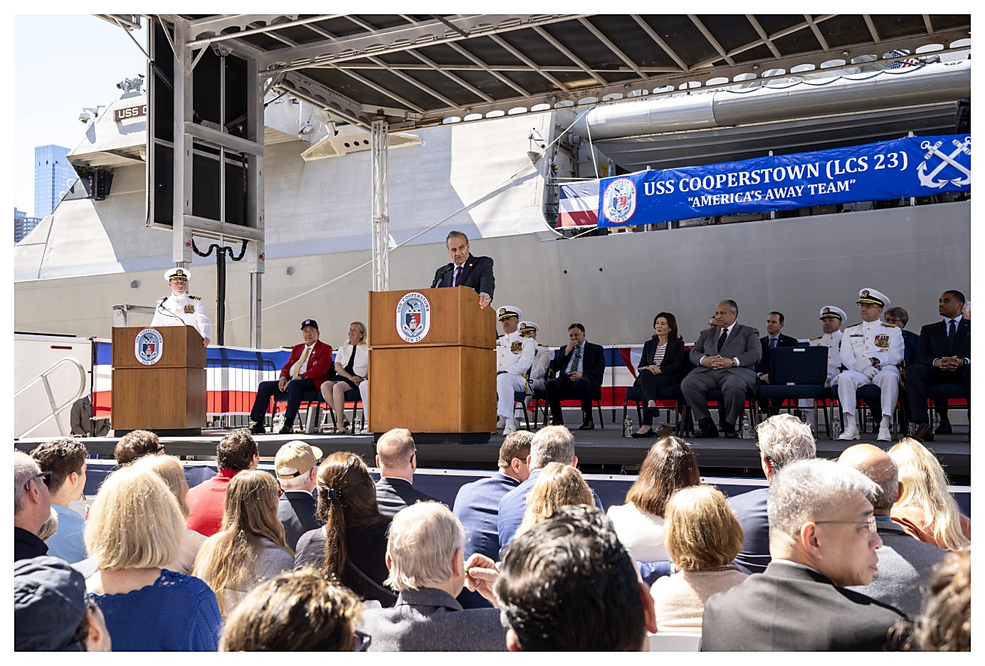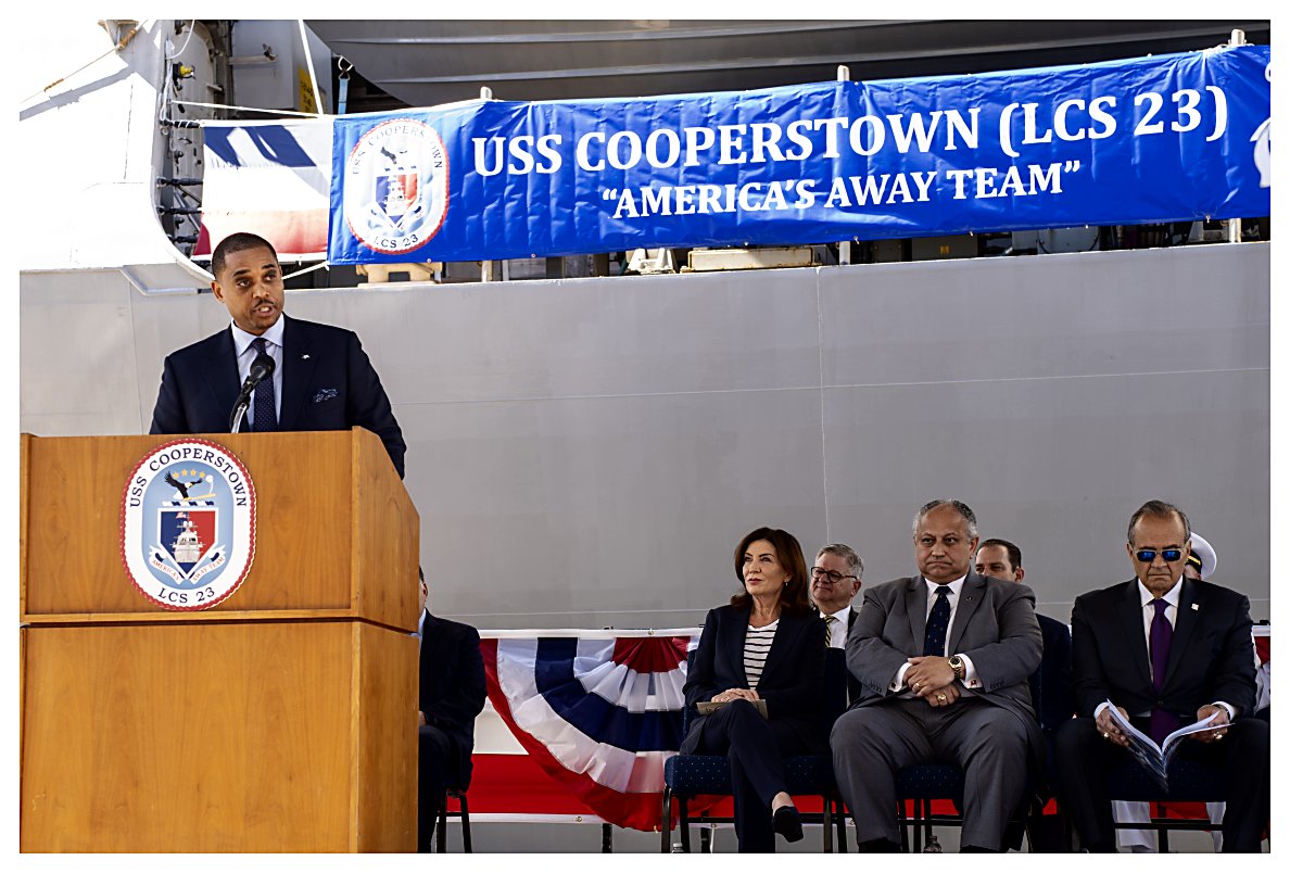 (Photos by MC1 Kevin C. Leitner, courtesy of the Defense Visual Information Distribution Service)2.) Reverend Gerald Murray, Chaplain, Navy League of the United States, New York Council, delivers the invocation during the Cooperstown ceremony. ..................................230506-N-OA516-1128 3.) Mr. Chauncey McIntosh, vice president of Integrated Warfare Systems and Sensors, Lockheed Martin, gives remarks during the commissioning ceremony. .........................230506-N-OA516-1170 4.) Vice Adm. John Mustin, Commander, U.S. Navy Reserve, gives remarks during the commissioning ceremony of littoral combat ship USS Cooperstown. ............................230506-N-OA516-1198 5.) Secretary of the Navy, the Honorable Carlos Del Toro, speaks during the commissioning ceremony of littoral combat ship USS Cooperstown. ..................................................230506-N-OA516-1264 6.) Mr. Joe Torre, a member of the National Baseball Hall of Fame, speaks during the commissioning ceremony of Cooperstown in New York City. .............................................230506-N-OA516-1361 7.) Cmdr. Daxton Moore, commanding officer of USS Cooperstown (LCS 23), gives remarks during her commissioning ceremony. .............................................................................230506-N-OA516-1512 8.) Ms. Jane Forbes Clark, chairman of the National Baseball Hall of Fame and Museum, and honorary sponsor of Cooperstown, gives remarks during the ceremony. ..........230506-N-OA516-1187 9.) The crew of the Navy's newest littoral combat ship, USS Cooperstown (LCS 23), brings the ship to life during its commissioning ceremony in New York City. .................230506-N-OA516-1471 10.) Mr. Johnny Bench, of the National Baseball Hall of Fame and Museum, passes the long glass to Lt. Warner Vanos, with instructions to "Set the First Watch." ..................230506-N-OA516-1380 1.) 1523027 2.) 1523028 3.) 1523029 4.) 1523030 5.) 1523031 6.) 1523032 7.) 1523033 8.) 1523034 9.) 1523035 10.) 1523036 | ||||
