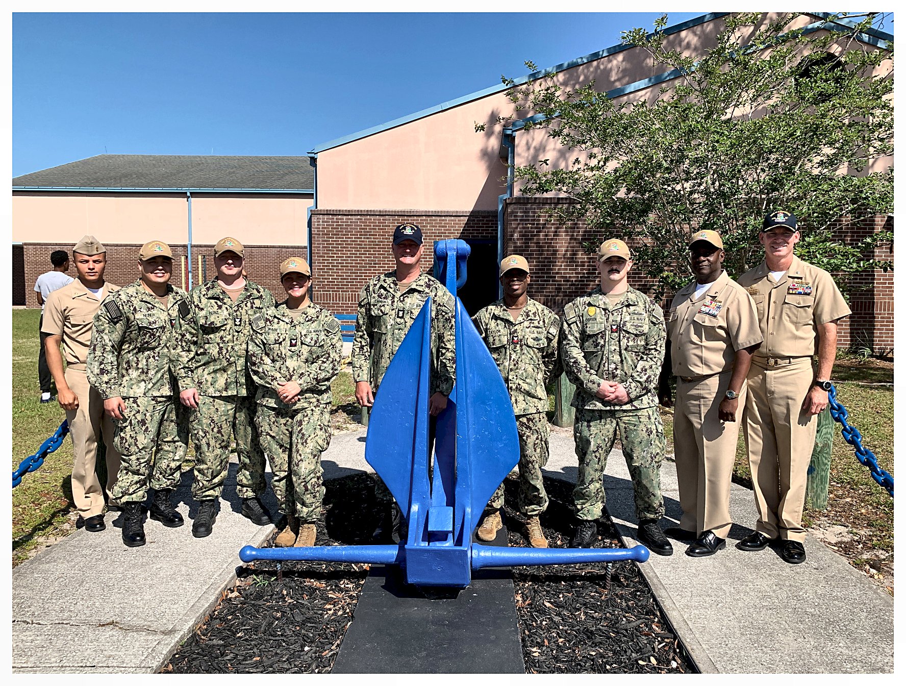 922k | 15 May 2023: Jacksonville, Fla. - Sailors of the future USS Marinette (LCS 25) and First Coast High School’s NJROTC Unit pose in front of the school’s anchor