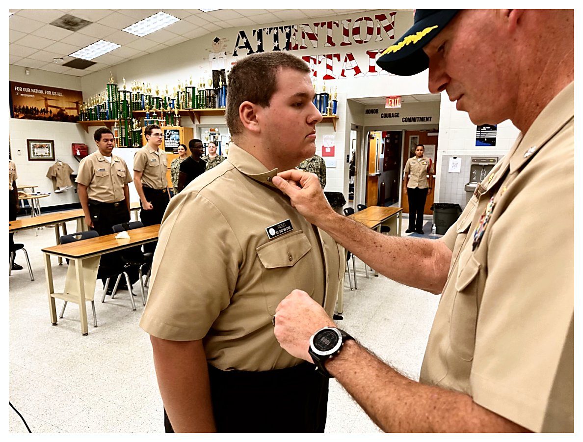 229k | 15 May 2023: Jacksonville, Fla. - Commander Timothy Brewer, Commanding Officer of the future USS Marinette (LCS 25) promotes a JNROTC Cadet of First Coast High