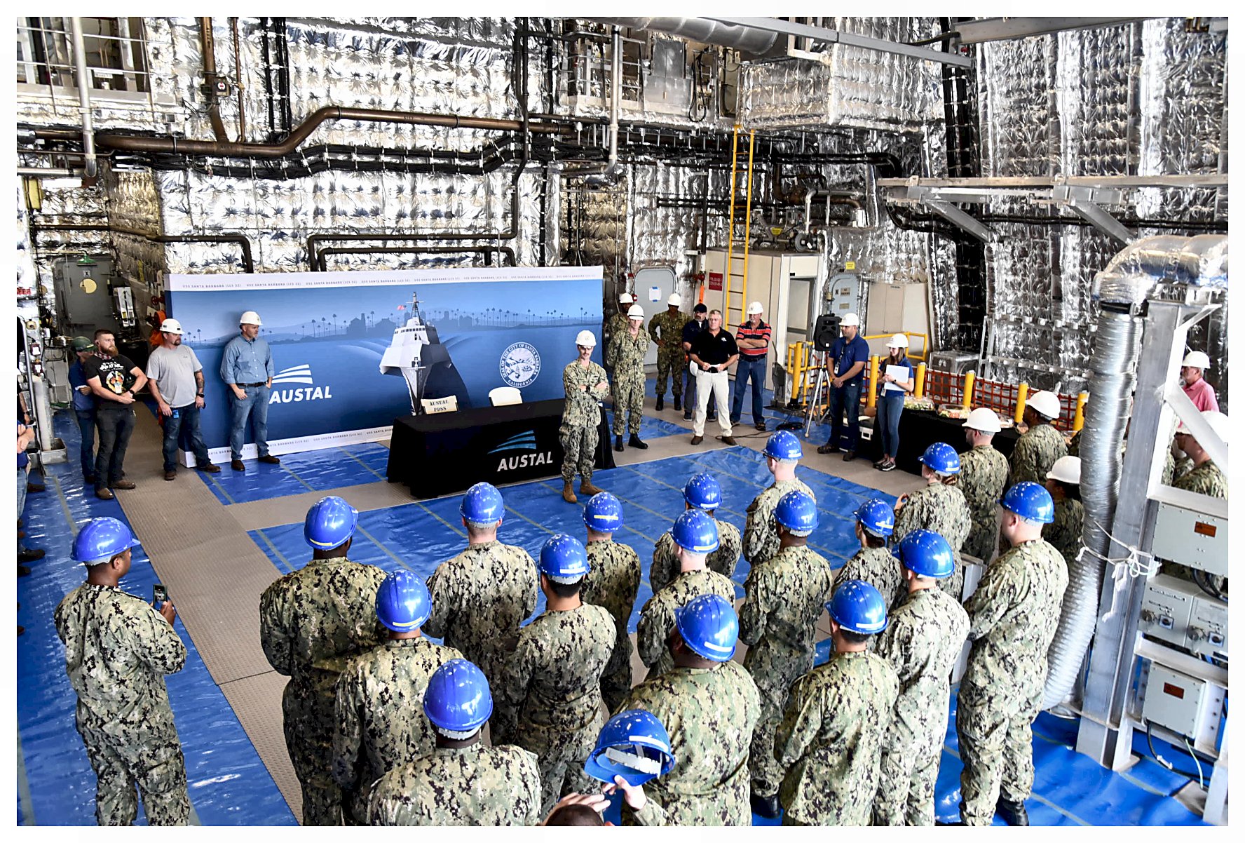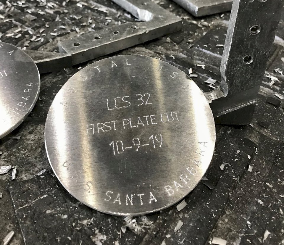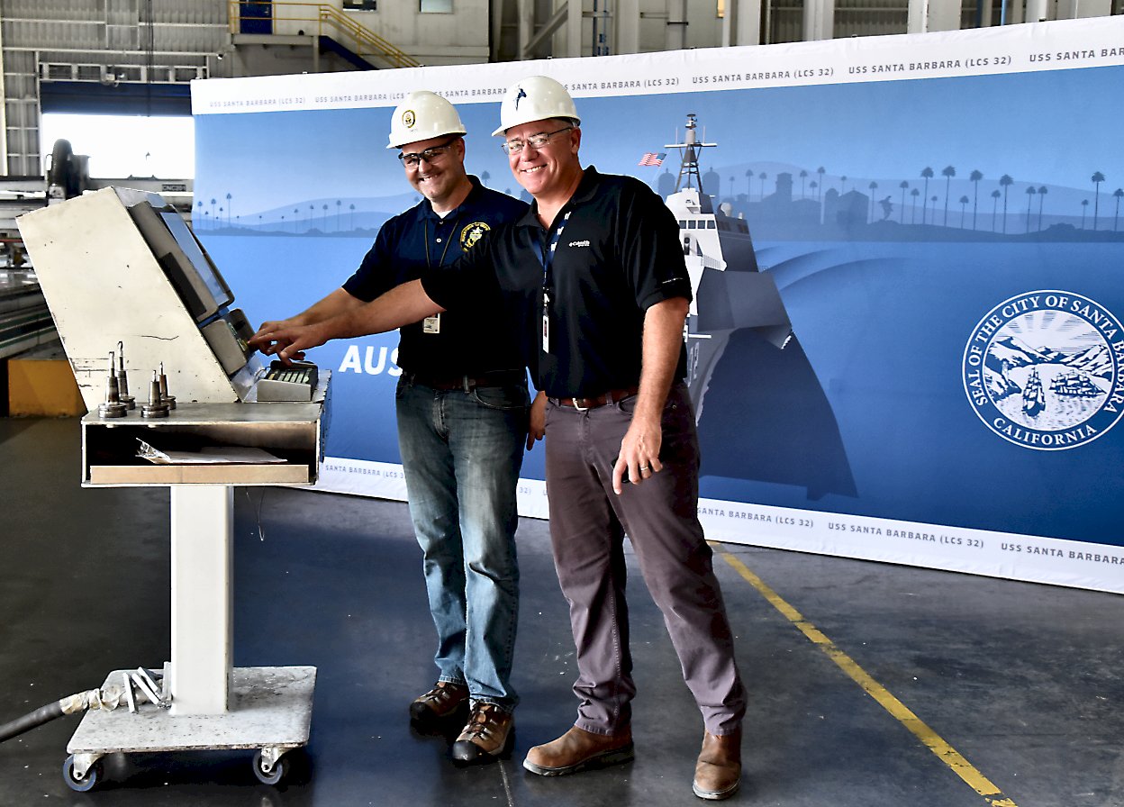 3.) 311k09 October 2019: Mobile, Ala. – Austal USA employees and Naval personnel pose for a photo before making the the first cut to fabricate metal sheeting for the future USS Santa Barbara. In the center photo, Dave Growden, Director LCS Program, and a fellow employee start the router for LCS 32. The right photo shows the aluminum disc made to commemorate the occasion. (Photos courtesy of Austal USA) 1.) 1532001 2.) 1532002 3.) 1532003 | |||||||||||