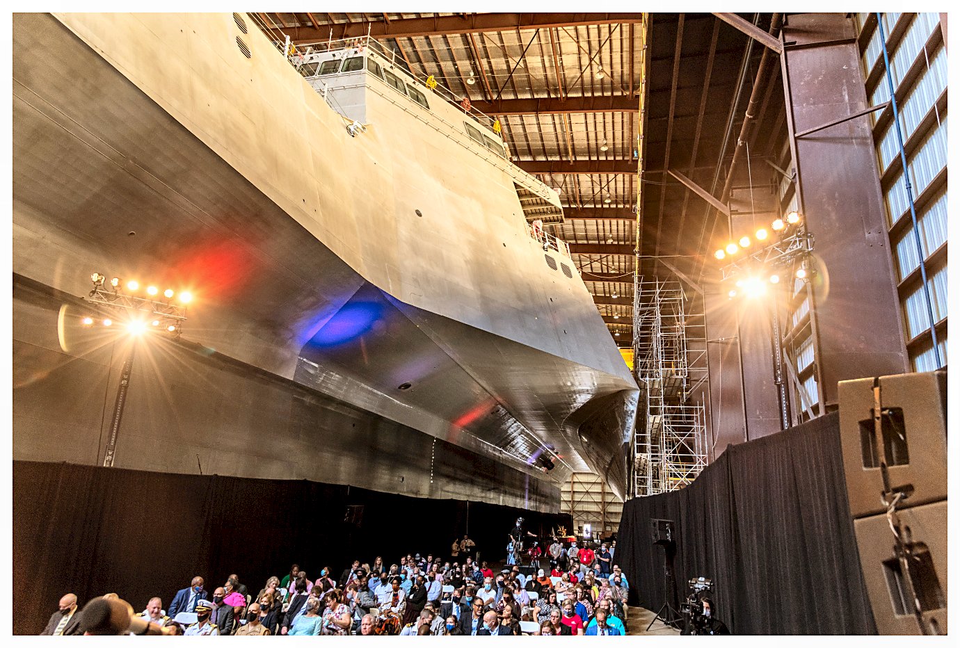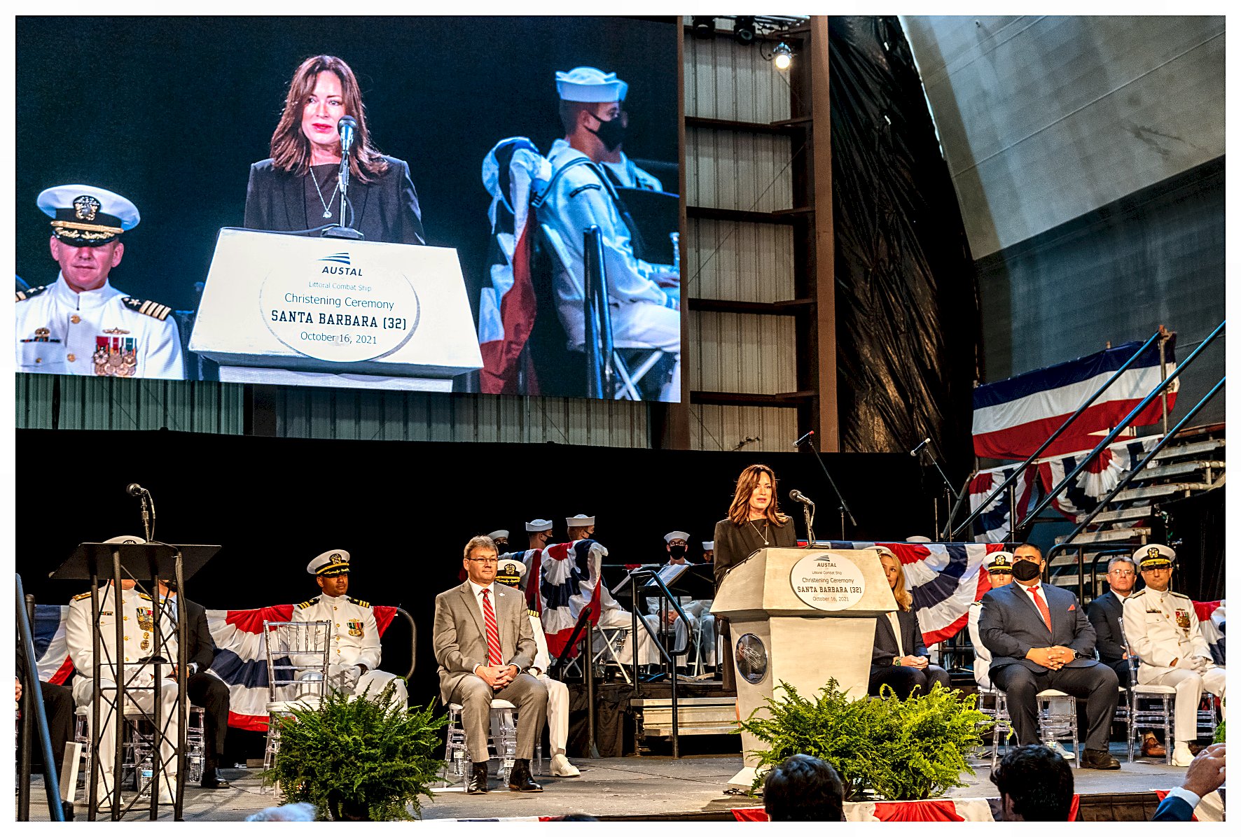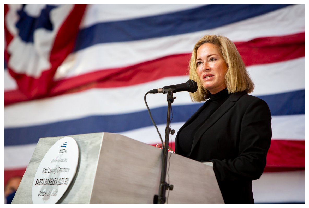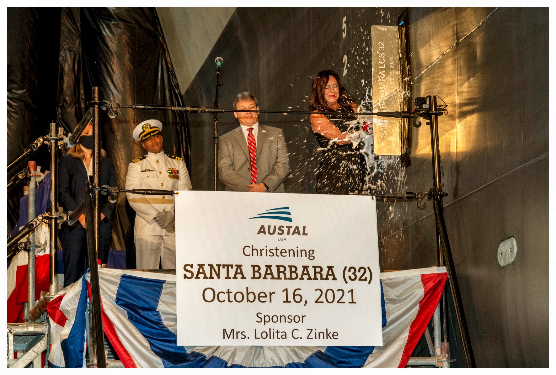 8.) 300k16 October 2021: Mobile, Ala. - In ceremonies held at the Austal USA Shipyard, Lolita Zinke, wife of former Secretary of Interior Ryan Zinke and the ship’s sponsor, participated in a time-honored Navy tradition to christen the ship by breaking a bottle of sparkling wine across her bow. Meredith Berger, performing the duties of undersecretary of the Navy, delivered the keynote address at the ceremony. Remarks were also provided by Vice Adm. Jeffrey Trussler, deputy chief of naval operations for information warfare; Oscar Gutierrez, mayor pro tempore for the city of Santa Barbara, California.; and Rusty Murdaugh, president of Austal USA. LCS 32 is the 16th Freedom-variant LCS and 32nd in the LCS class. It is the third Navy ship named in honor of the city of Santa Barbara. The first USS Santa Barbara (Id. No. 4522) was a single-screw steel freighter that was placed into commission by the Navy on 15 April 1918, in New York. The ship made four round-trip voyages to Europe during and after World War I and was decommissioned 06 August 1919, and returned to her owners. Later renamed American, the ship was sunk by German submarine torpedoes off the east coast of British Honduras (modern-day Belize) on 11 June 1942. The second USS Santa Barbara (AE 28) was commissioned on 11 July 1970. The Kilauea-class ammunition ship completed deployments to the Mediterranean, the western Pacific, and the Caribbean before being decommissioned in 1998. (Photos courtesy of Austal USA) 1.) 1532008 2.) 1532009 3.) 1532010 4.) 1532011 5.) 1532012 6.) 1532013 7.) 1532011 8.) 1532015 | |||||||||||