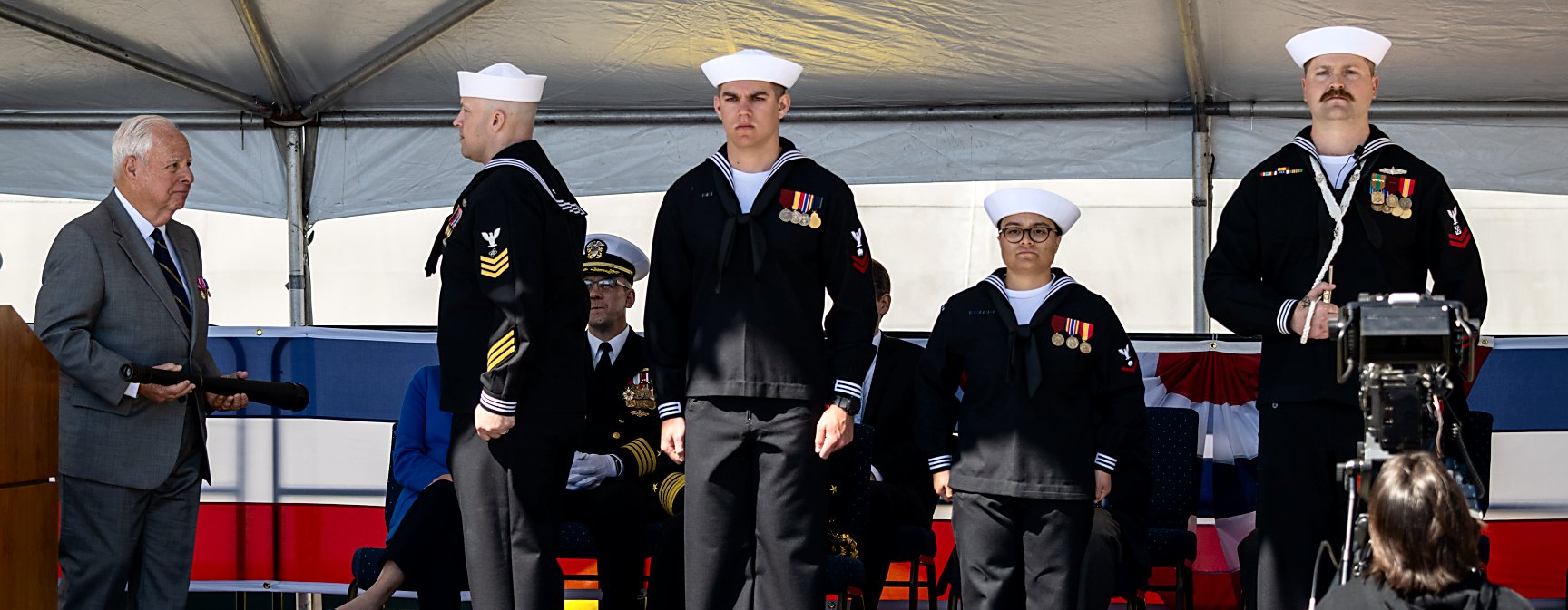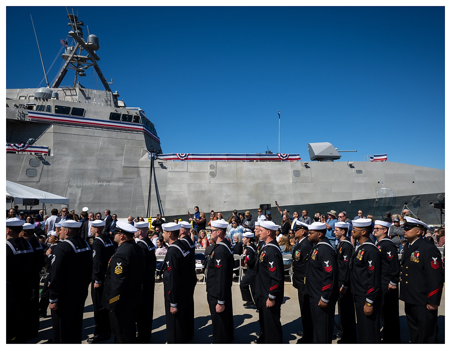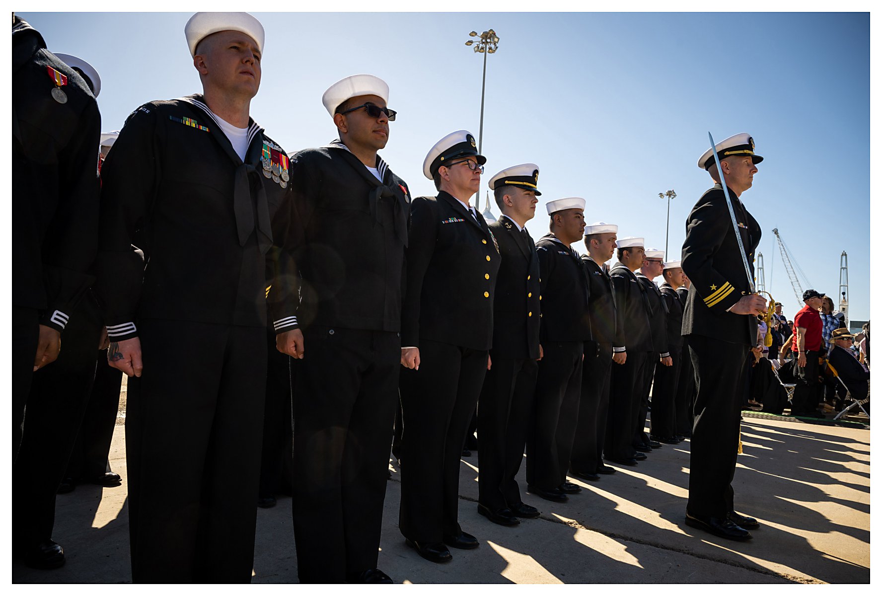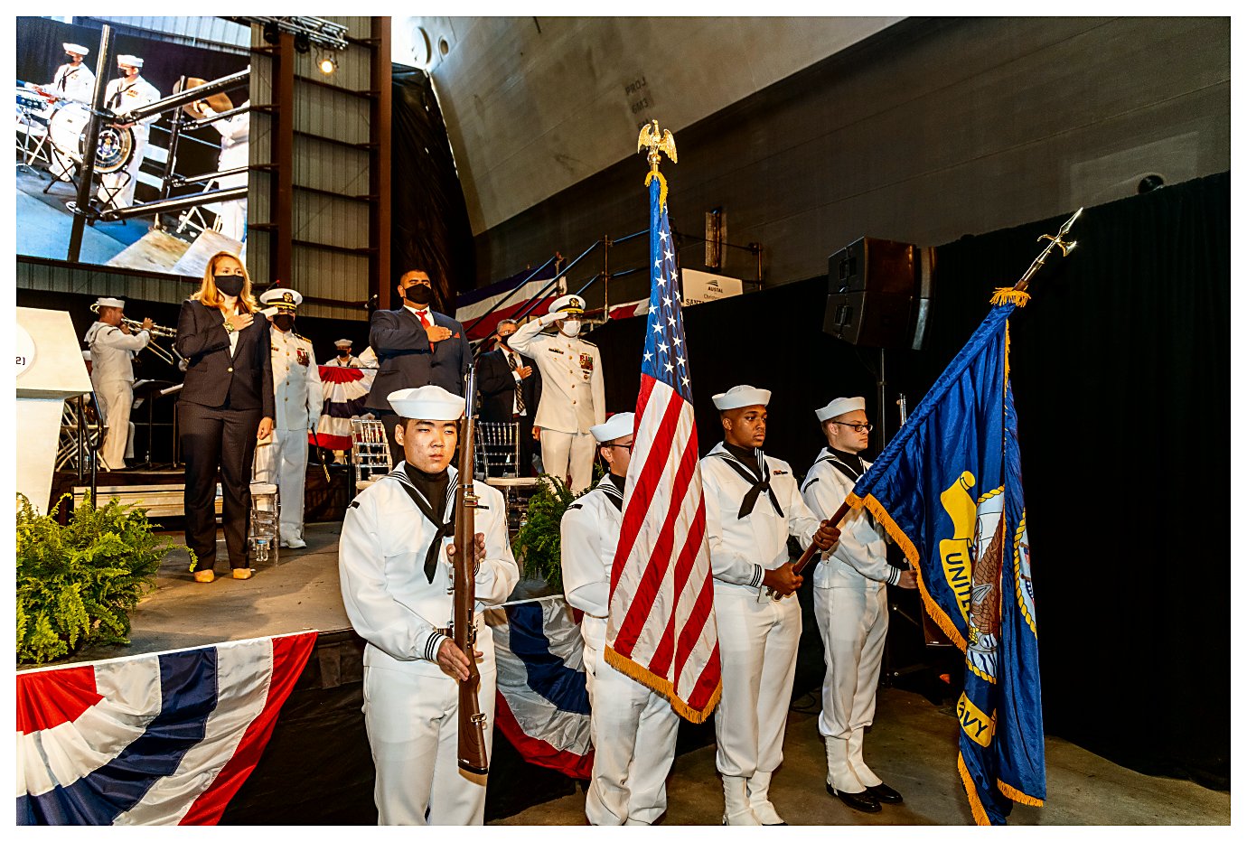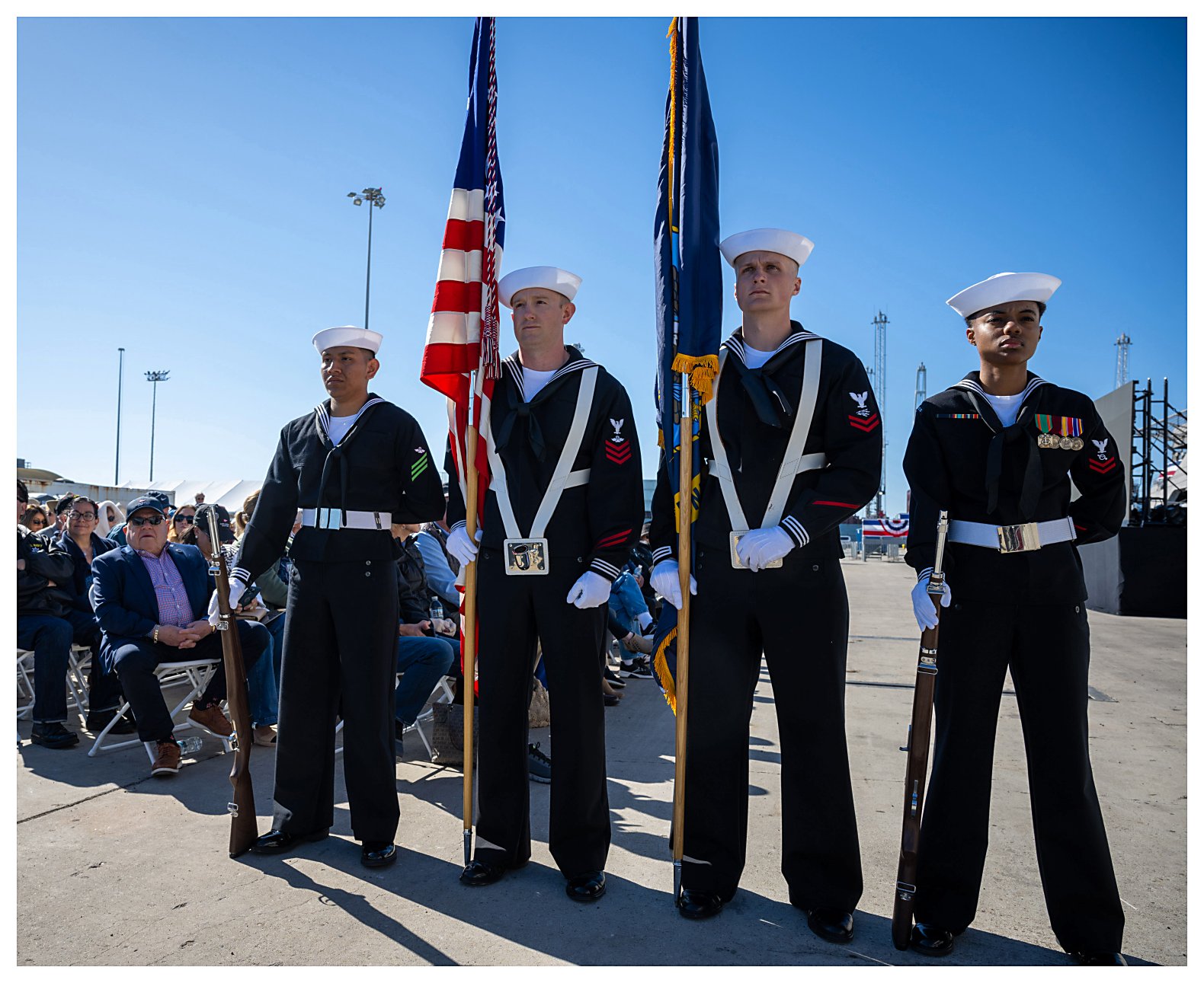 1.) A Naval Base Ventura County color guard detail stands at parade rest, prepared for the presentation of colors during the USS Santa Barbara commissioning ceremony.
