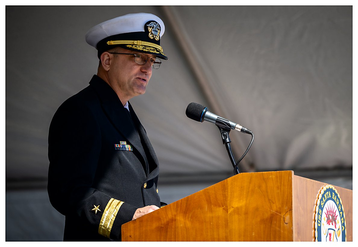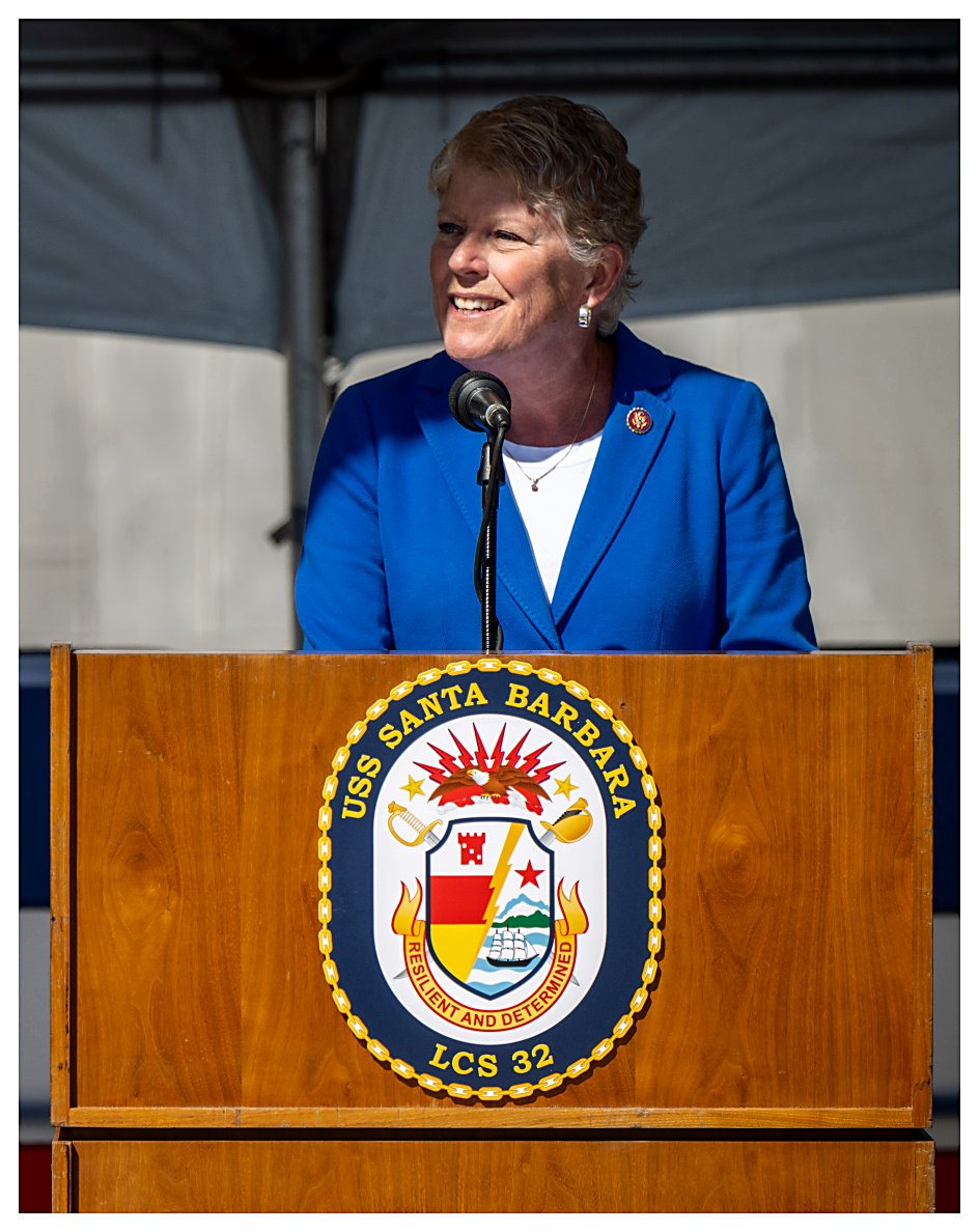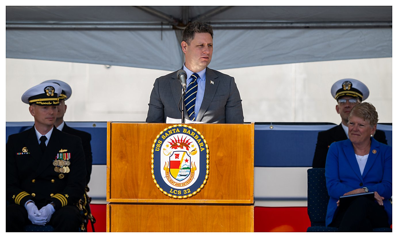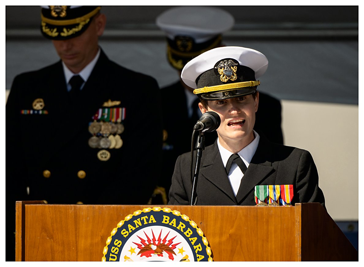 ..........................230401-N-SR235-034 2.) Radm. Casey Moton (center) and Navy Ass't Sec. Russell Rumbaugh (right) stand for the colors and the national anthem. ......................................................................................................................230401-N-SR235-051 3.) Lt. Marie Tracy delivers the invocation at the beginning of the commissioning ceremony for USS Santa Barbara. .....................................................................................................................................230401-N-SR235-674 4.) U.S. Rep. Julia Brownley of Westlake Village, California, welcomes guests as she delivers opening remarks at the commissioning of USS Santa Barbara. .....................................................230401-N-SR235-263 5.) Naval Sea Systems Command Unmanned and Small Combatants Program Exec. Officer Radm. Casey Moton speaks about littoral combat ship USS Santa Barbara . ...............................230401-N-SR235-455 6.) Assistant Secretary of the Navy, Comptroller Russell Rumbaugh (center) is flanked by LCS 32 CO, Cmdr. Brian Sparks (left) and U.S. Rep. Julia Brownley (right). ...................................230401-N-SR235-926 7.) Commanding Officer Cmdr. Brian Sparks accepts a proclamation from Santa Barbara Mayor Randy Rowse declaring 01 April USS Santa Barbara Day in the city. ...................................230401-N-SR235-793 8.) Officers and crew members of USS Santa Barbara (LCS 32) stand at attention during their ship’s commissioning ceremony. ...............................................................................................................230401-N-SR235-492 9.) As guests record the moment with their smartphone cameras, the crew of USS Santa Barbara (LCS 32) begins to man the ship during its commissioning ceremony. ...................................230401-N-SR235-717 10.) Retired Navy Capt. Richard Sloane passes a long glass to ET1 Kyle Smith, with MN2 Gunner McIntosh, MN3 Aulii Noble and BM2 Zachary Livingston, as the first watch is set. .....230401-N-SR235-107 11.) Sailors aboard USS Santa Barbara (LCS 32) salute after manning the ship and bringing her to life during her commissioning ceremony. .......................................................................................230401-N-SR235-176 (Photos courtesy of the Defense Visual Information Distribution Service) 1.) 1532024 2.) 1532025 3.) 1532026 4.) 1532027 5.) 1532028 6.) 1532029 7.) 1532030 8.) 1532031 9.) 1532032 10.) 1532033 11.) 1532034