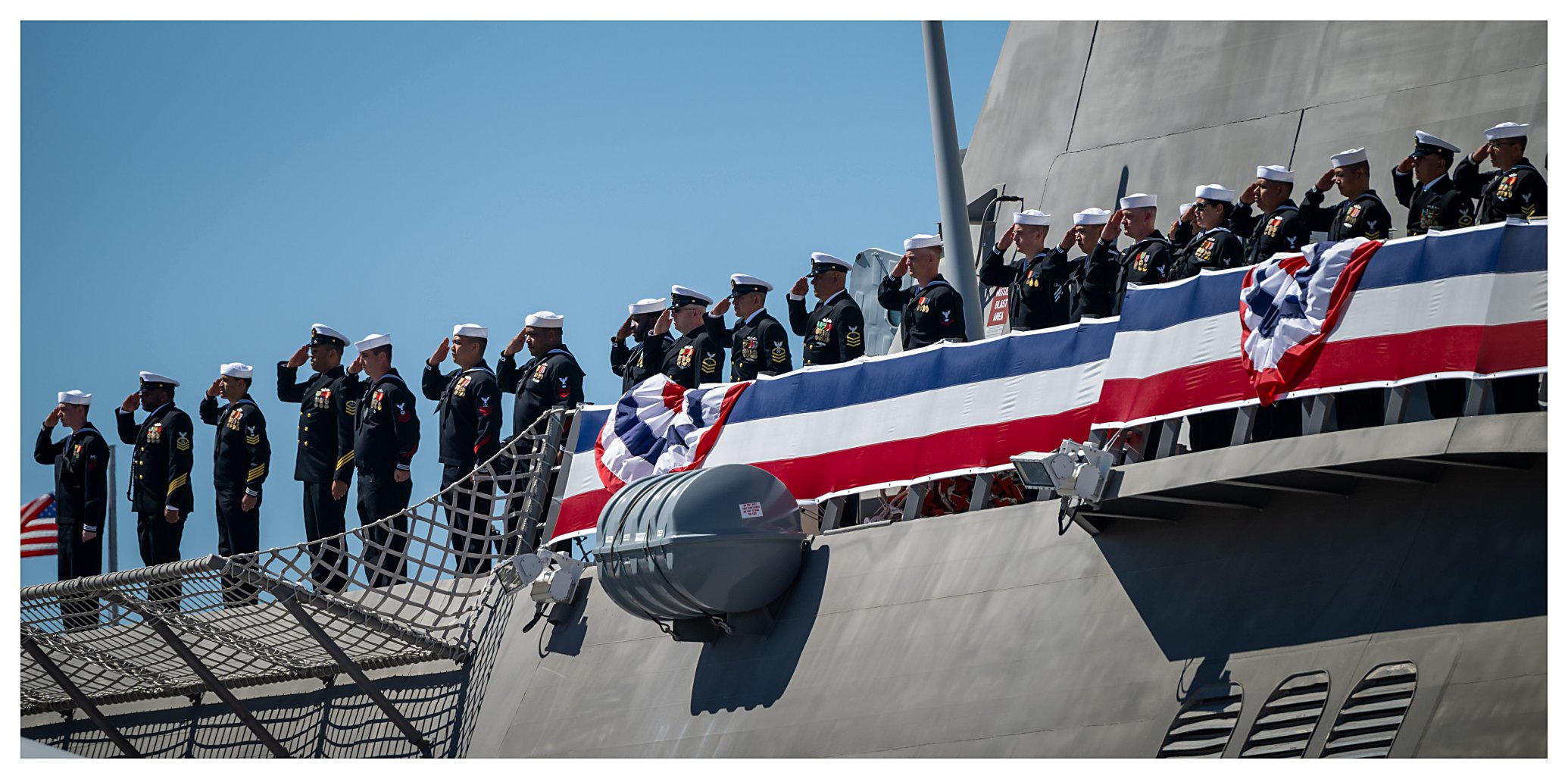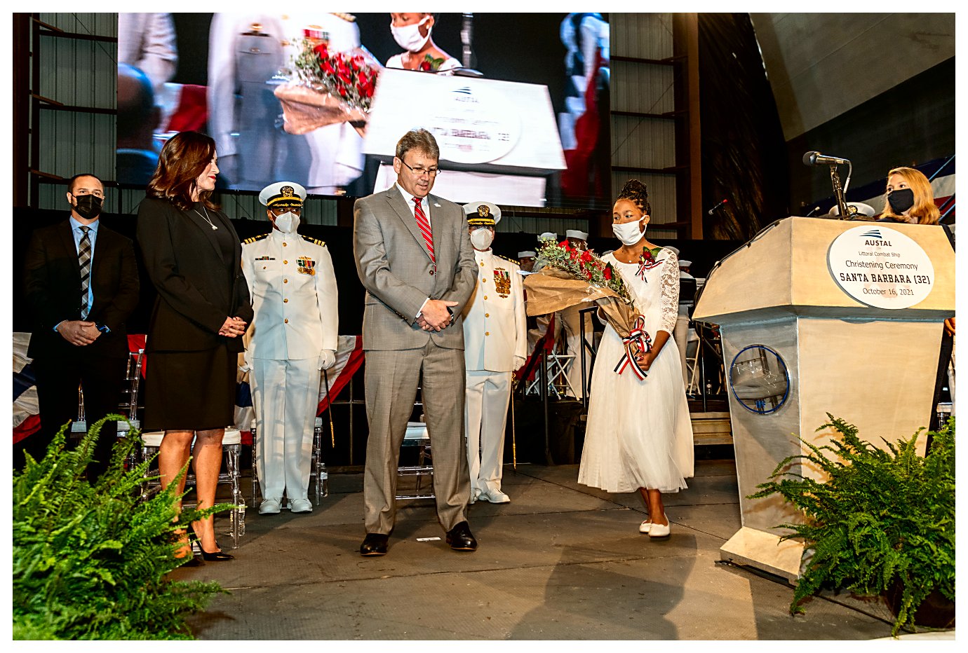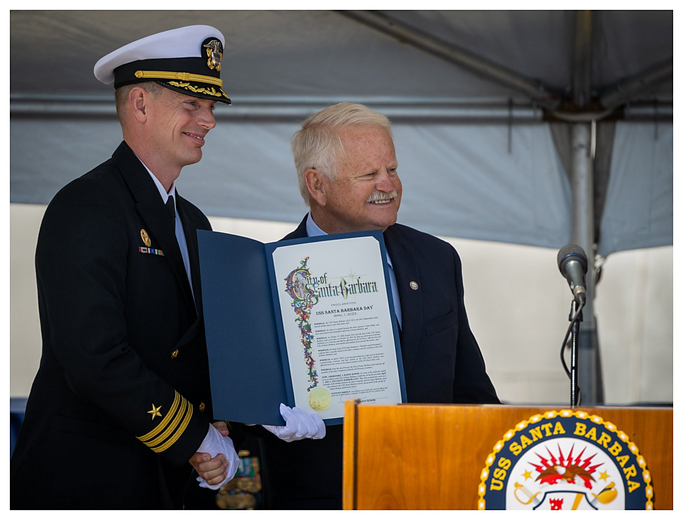 ..........................230401-N-SR235-034 2.) Radm. Casey Moton (center) and Navy Ass't Sec. Russell Rumbaugh (right) stand for the colors and the national anthem. ......................................................................................................................230401-N-SR235-051 3.) Lt. Marie Tracy delivers the invocation at the beginning of the commissioning ceremony for USS Santa Barbara. .....................................................................................................................................230401-N-SR235-674 4.) U.S. Rep. Julia Brownley of Westlake Village, California, welcomes guests as she delivers opening remarks at the commissioning of USS Santa Barbara. .....................................................230401-N-SR235-263 5.) Naval Sea Systems Command Unmanned and Small Combatants Program Exec. Officer Radm. Casey Moton speaks about littoral combat ship USS Santa Barbara . ...............................230401-N-SR235-455 6.) Assistant Secretary of the Navy, Comptroller Russell Rumbaugh (center) is flanked by LCS 32 CO, Cmdr. Brian Sparks (left) and U.S. Rep. Julia Brownley (right). ...................................230401-N-SR235-926 7.) Commanding Officer Cmdr. Brian Sparks accepts a proclamation from Santa Barbara Mayor Randy Rowse declaring 01 April USS Santa Barbara Day in the city. ...................................230401-N-SR235-793 8.) Officers and crew members of USS Santa Barbara (LCS 32) stand at attention during their ship’s commissioning ceremony. ...............................................................................................................230401-N-SR235-492 9.) As guests record the moment with their smartphone cameras, the crew of USS Santa Barbara (LCS 32) begins to man the ship during its commissioning ceremony. ...................................230401-N-SR235-717 10.) Retired Navy Capt. Richard Sloane passes a long glass to ET1 Kyle Smith, with MN2 Gunner McIntosh, MN3 Aulii Noble and BM2 Zachary Livingston, as the first watch is set. .....230401-N-SR235-107 11.) Sailors aboard USS Santa Barbara (LCS 32) salute after manning the ship and bringing her to life during her commissioning ceremony. .......................................................................................230401-N-SR235-176 (Photos courtesy of the Defense Visual Information Distribution Service) 1.) 1532024 2.) 1532025 3.) 1532026 4.) 1532027 5.) 1532028 6.) 1532029 7.) 1532030 8.) 1532031 9.) 1532032 10.) 1532033 11.) 1532034