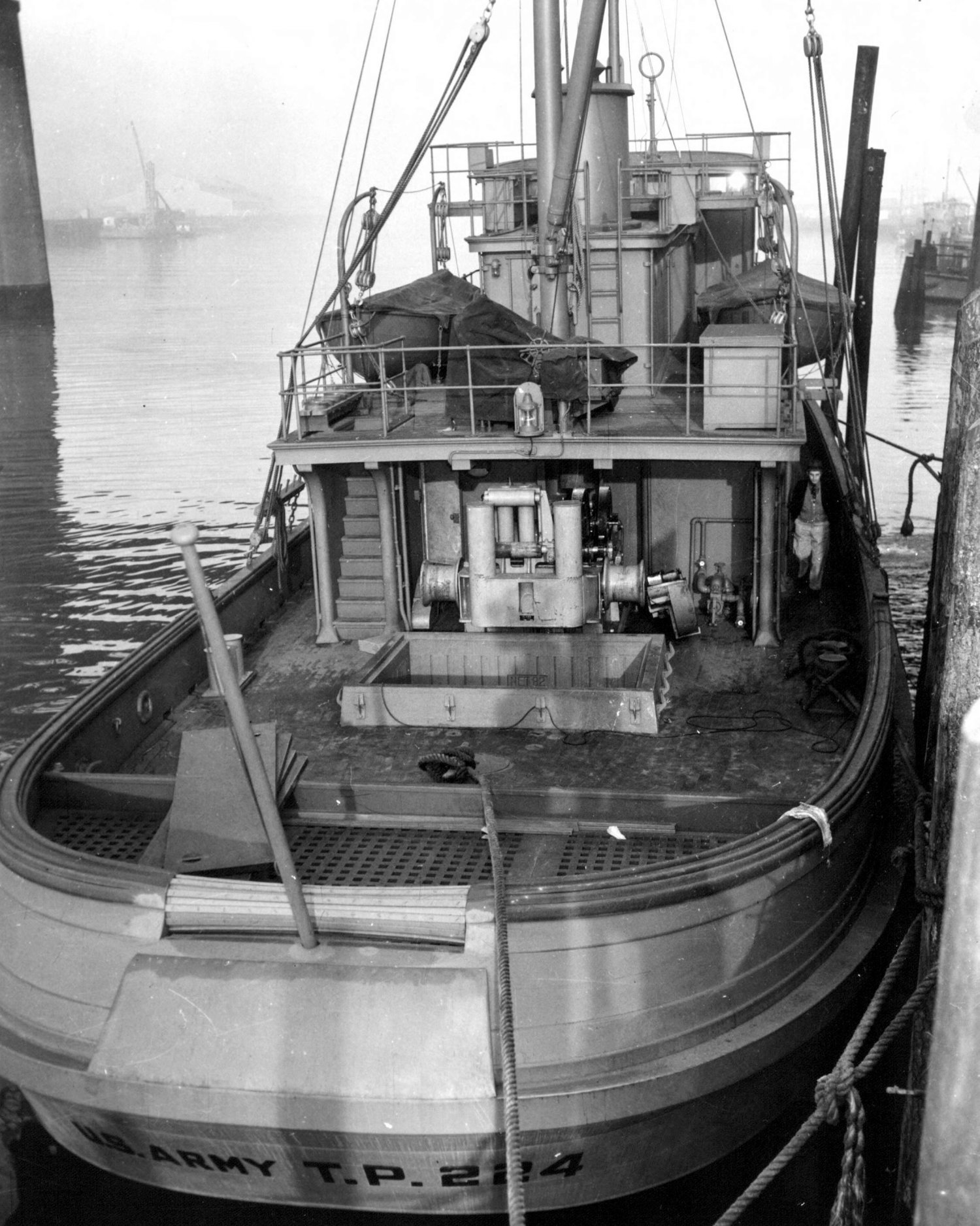 461k Stern view of US Army Transportation Corp. Hull No. 8, US Army Tender TP-224 moored at Petrich Shipbuilding Corp. under the 11th Street Bridge at Tacoma, WA.