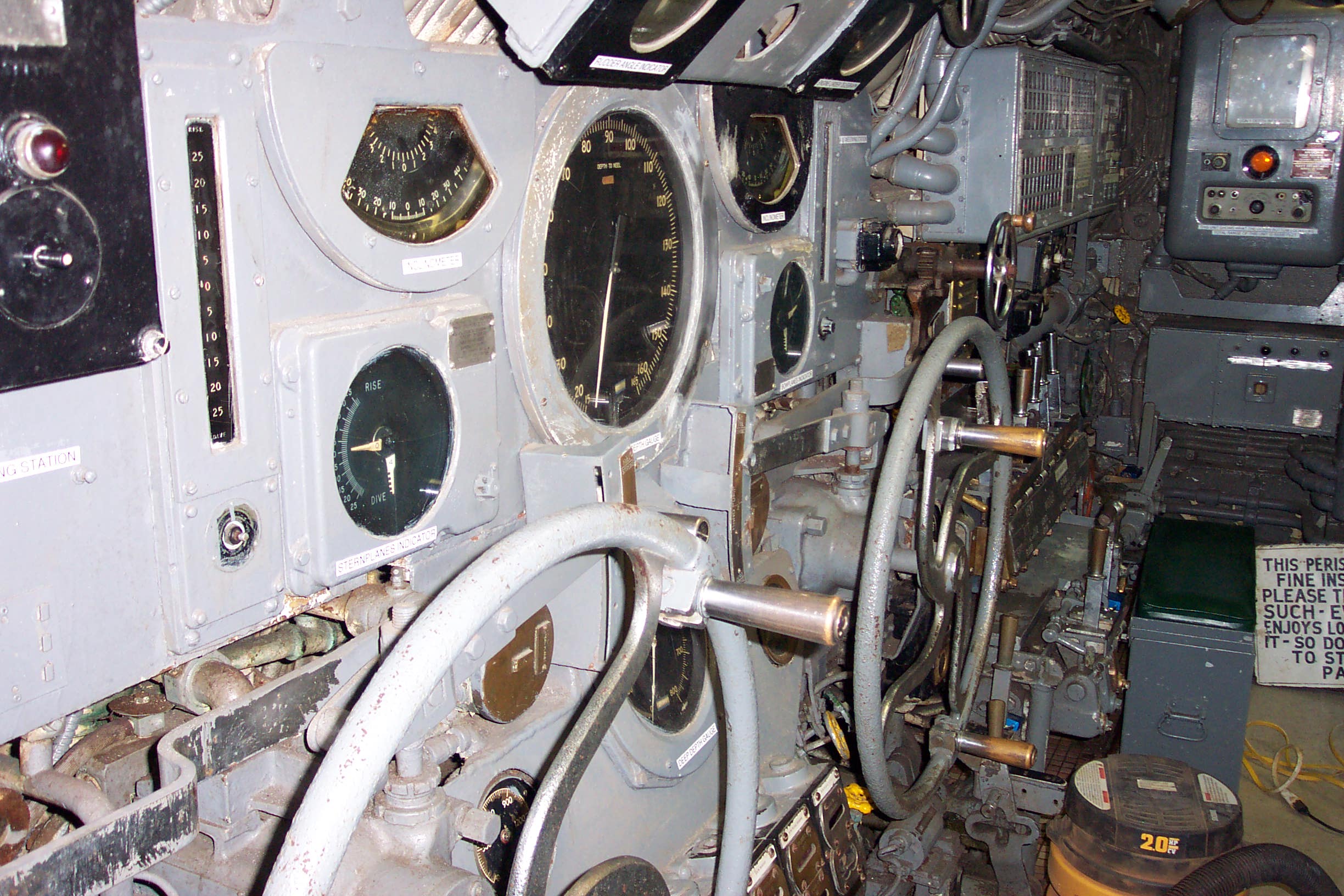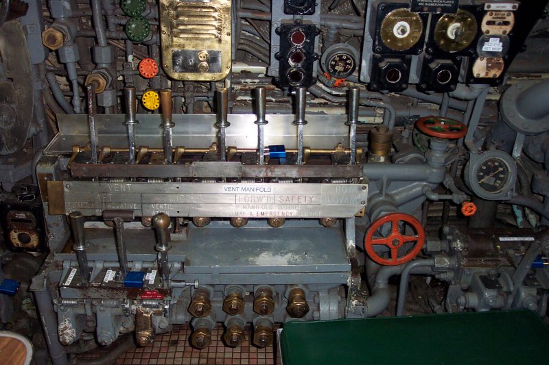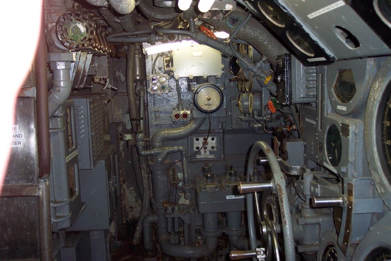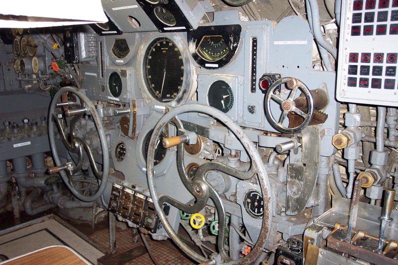 130k | Control Room. Dive station. Wheel to left controls rear dive plane Wheel to Right controls forward plane. High Resolution Image 533K |
