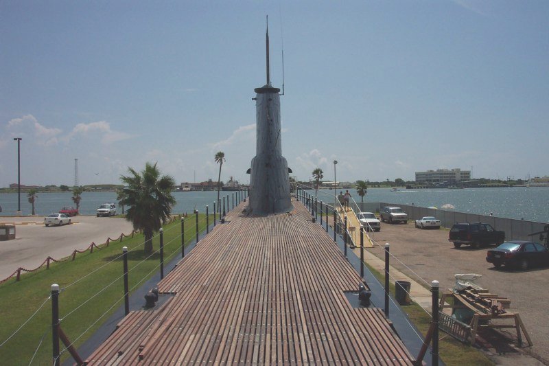 80k | From Aft Torpedo Room hatch looking forward. Note newly restored decking. Directly across from Seawolf Park is USCG Station Galveston Note, Below the white building to right center at dock is USS TEMPEST PC-2, She is stationed here to protect the ports of Houston - Galveston. High Resolution Image 353K |