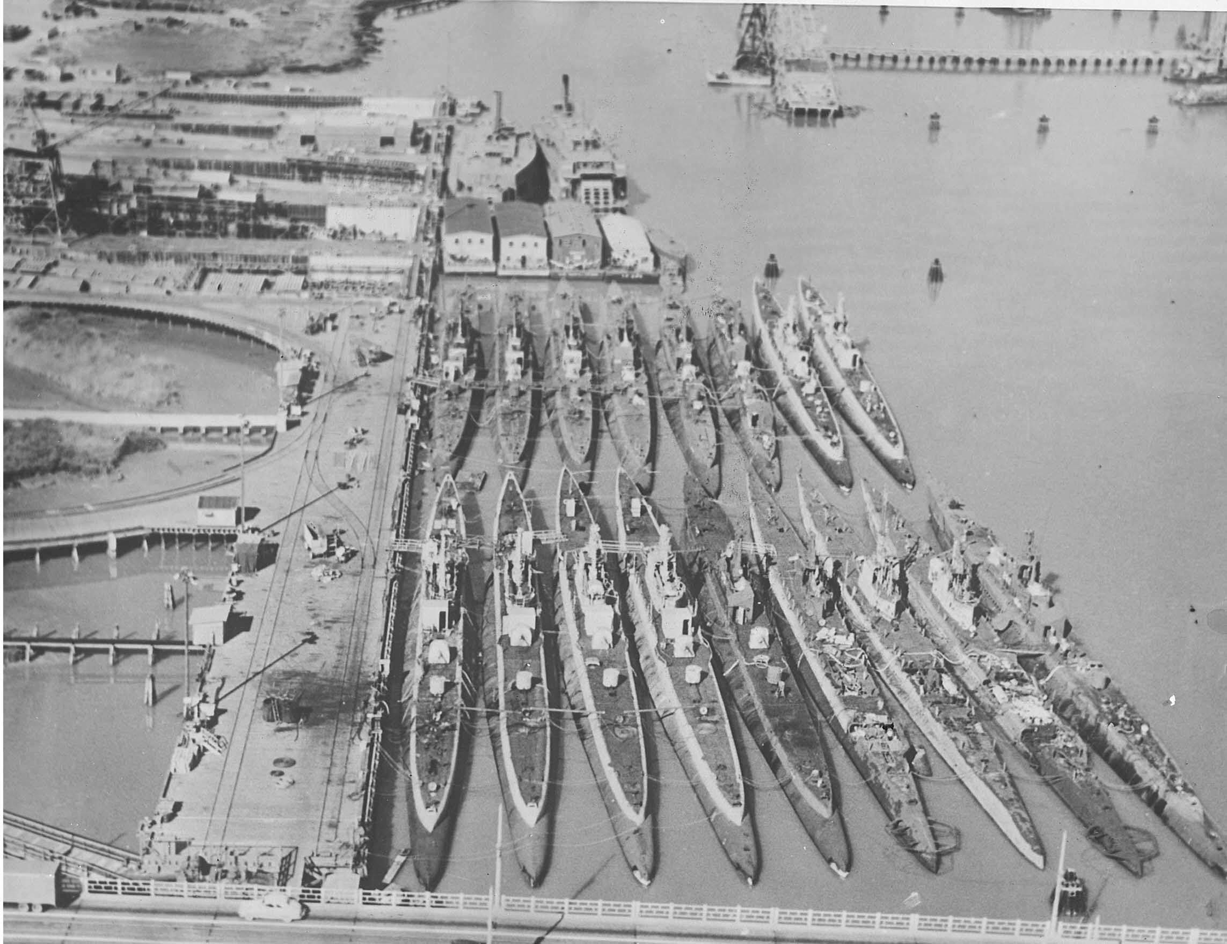 1.93k | Aerial view of decommissioned submarine at Mare Island Reserve Fleet taken on 18 March 1946. The majority of the personnel topside are navy personnel. I would say they are still inactivating the subs. Submarines are from top to bottom: Bashaw (SS-241), Guitarro (SS-363), Mingo (SS-261), Gurnard (SS-254), Pampanito (SS-383), Sand Lance (SS-381), Bream (SS-243), Hammerhead (SS-364) Sealion (SS-315), Tinosa (SS-283) & Pintado (SS-387) plus YC 316. |