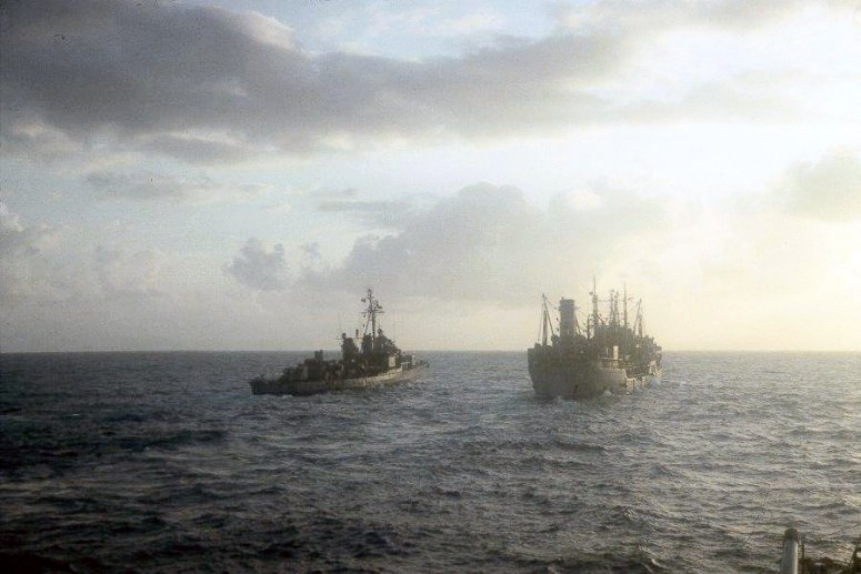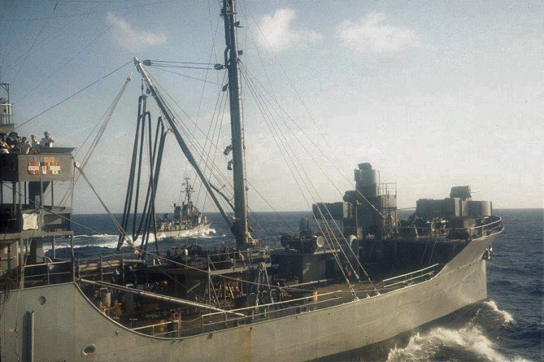 83k | USS Kankakee (AO-39) underway with USS Gainard (DD-706) coming alongside to port for refueling. | © Richard Leonhardt | |