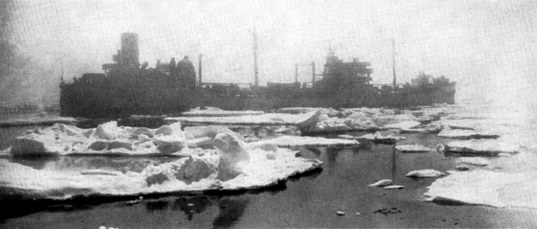 235k | USS Kankakee (AO-39) waits for help from a Canadian icebreaker while on duty in Arctic waters, circa 1958.