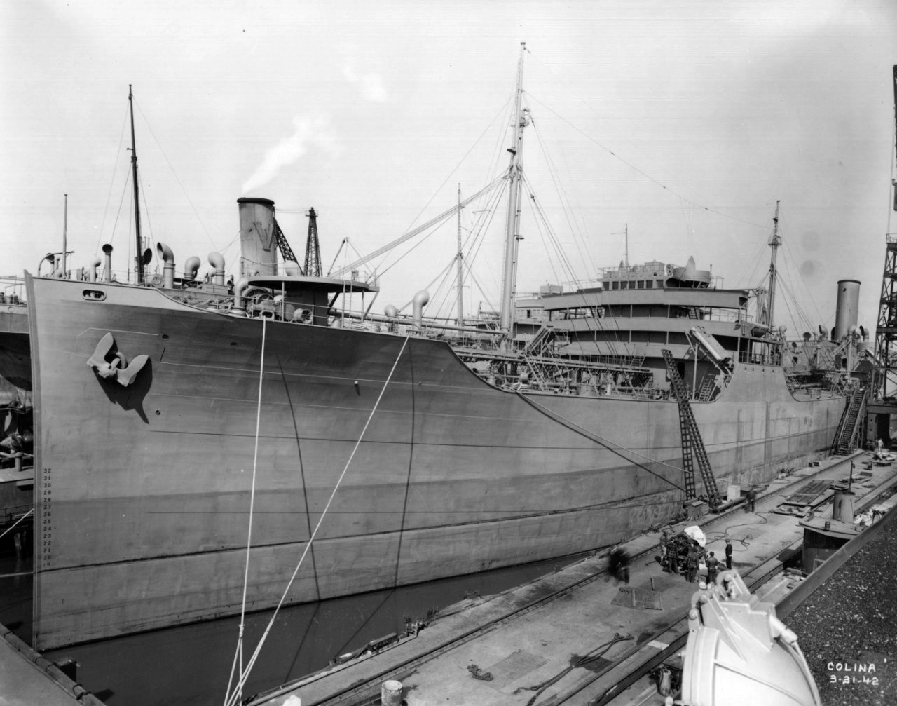 193k | US Maritime Administration tanker Colina at Bethlehem Steel Shipyard, Sparrows Point, MD., 31 March 1942, prior to acquisition by the Navy; note lack of armament at this point.
