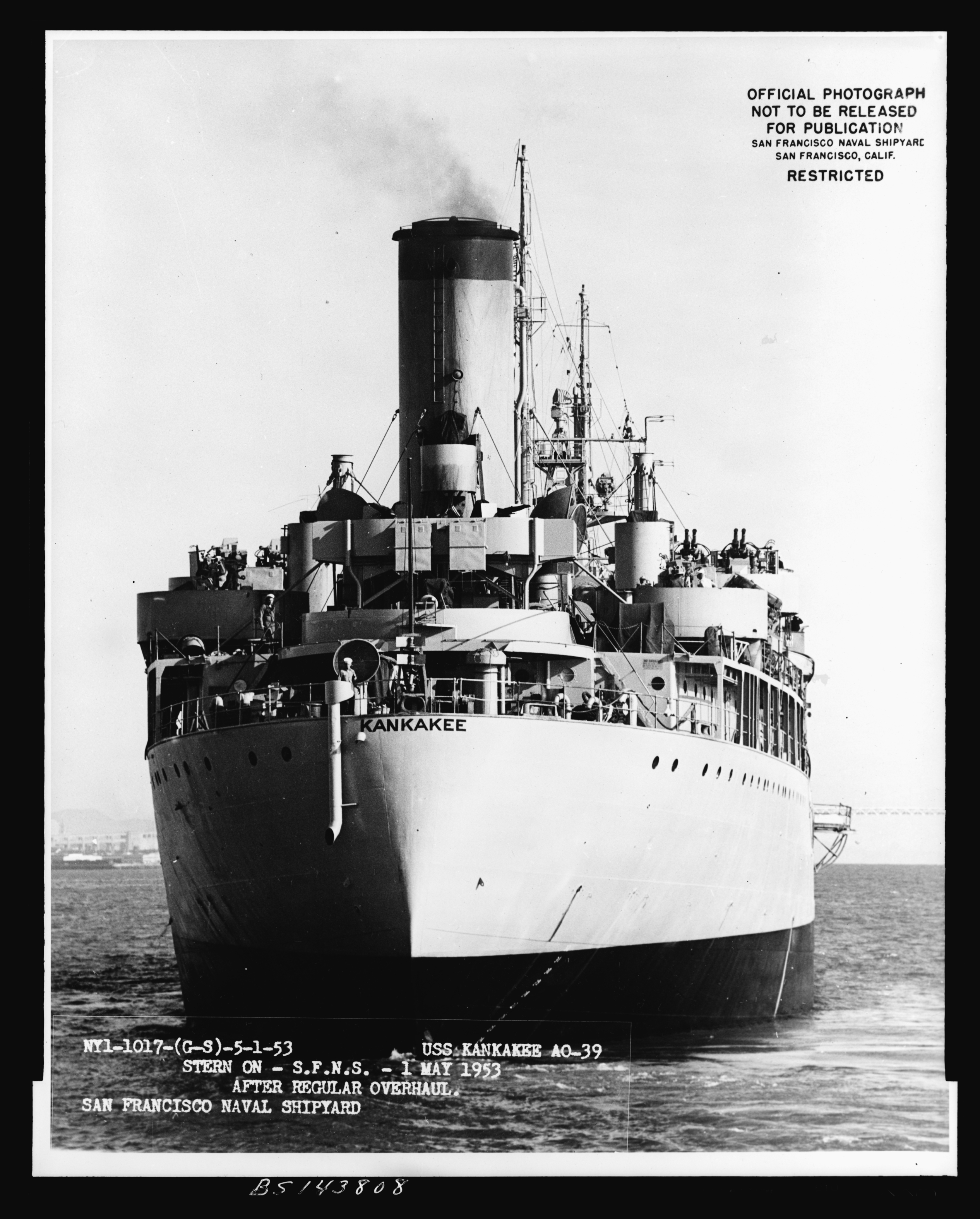 3124k | Stern on view of USS Kankakee (AO-39) departing San Francisco Naval Shipyard (Hunters Point), 1 May 1953, after regular overhaul.
