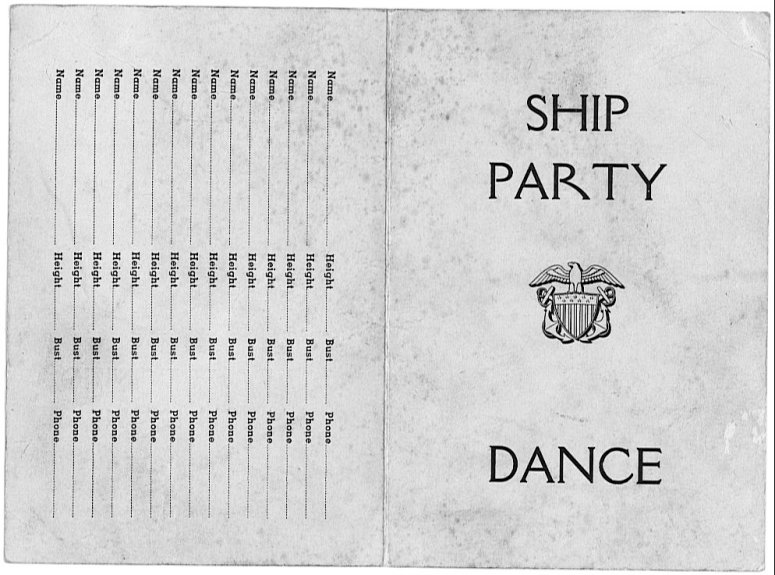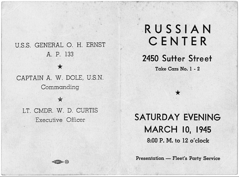 95k | General Oswald H. Ernst (AP-133) Ship's Dance program, 10 March 1945, at the Russian Center, San Francisco, CA. (front and back cover). Notice on the back cover what is important about the young ladies the sailors danced with. | Submitted by Sue Young for her father, Virgle Bruce Chaney S1/c USS General O.H. Ernst AP-133, 1944-1945 | |