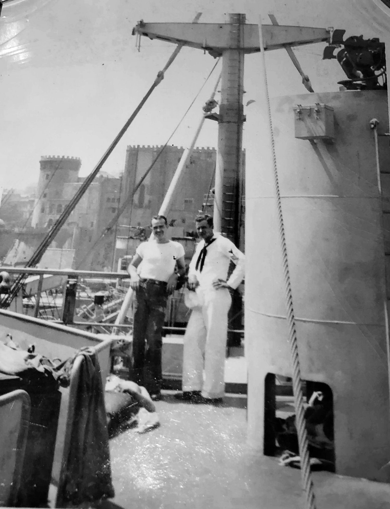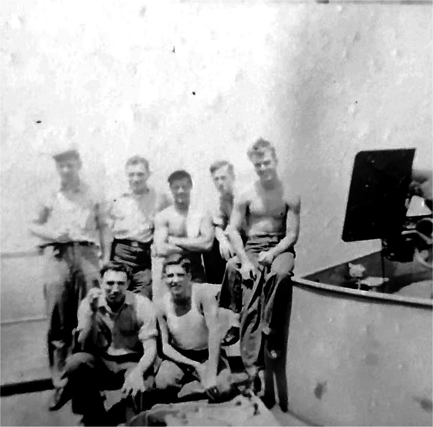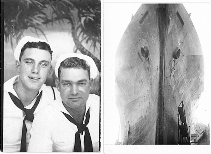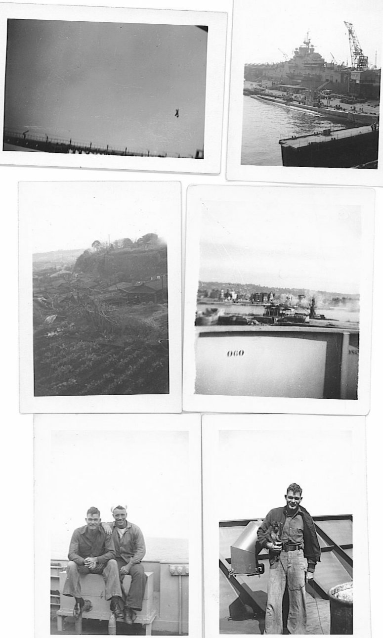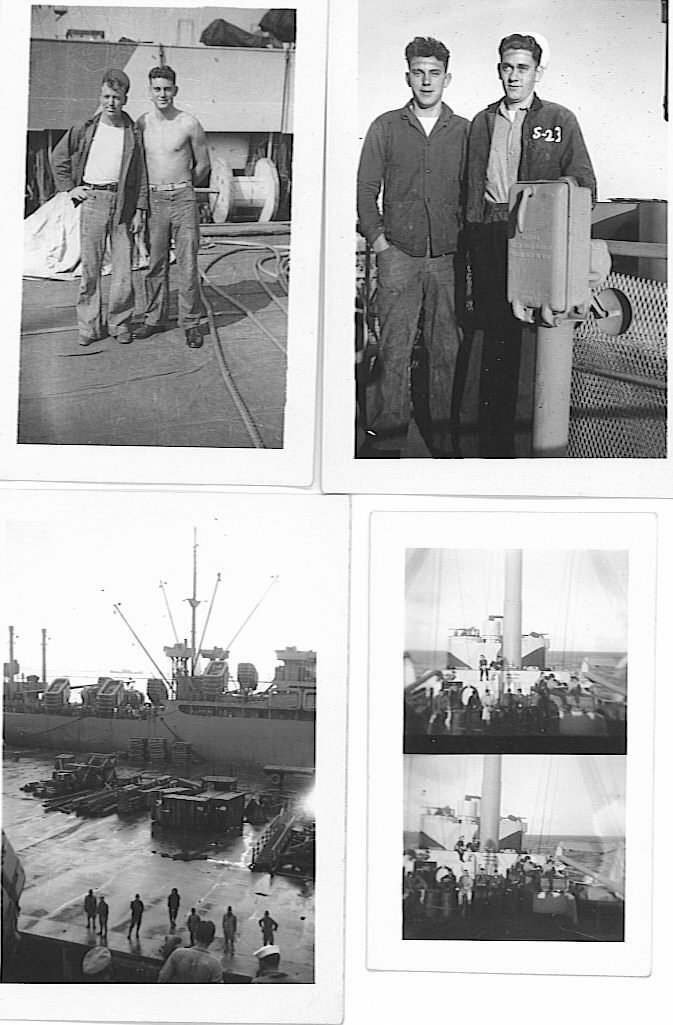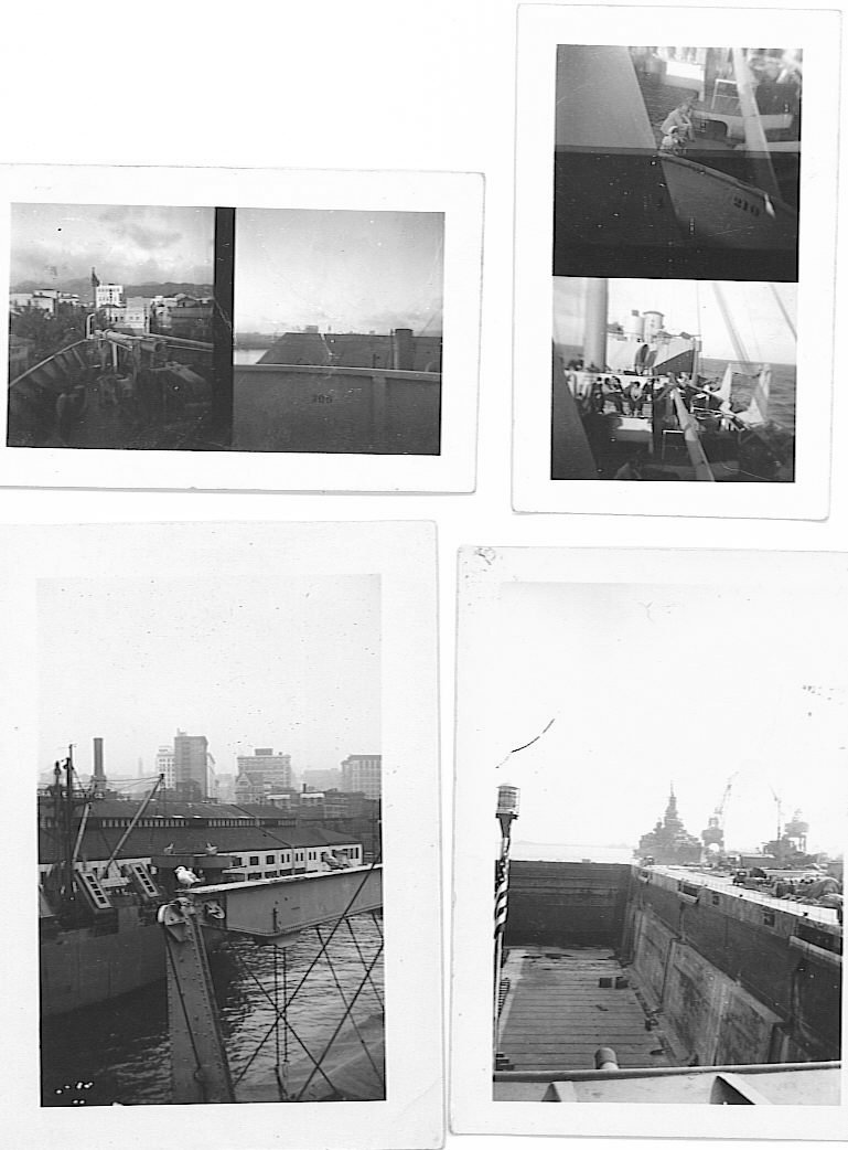 |  Upper Left - Bruce Chaney(without shirt) & John Goen, Upper Right - Bruce Chaney & Edwin Cates (with S-23 on Jacket) Lower Left - General O.H Ernst docked at Yokohama, Japan. Lower Right - USO show aboard ship