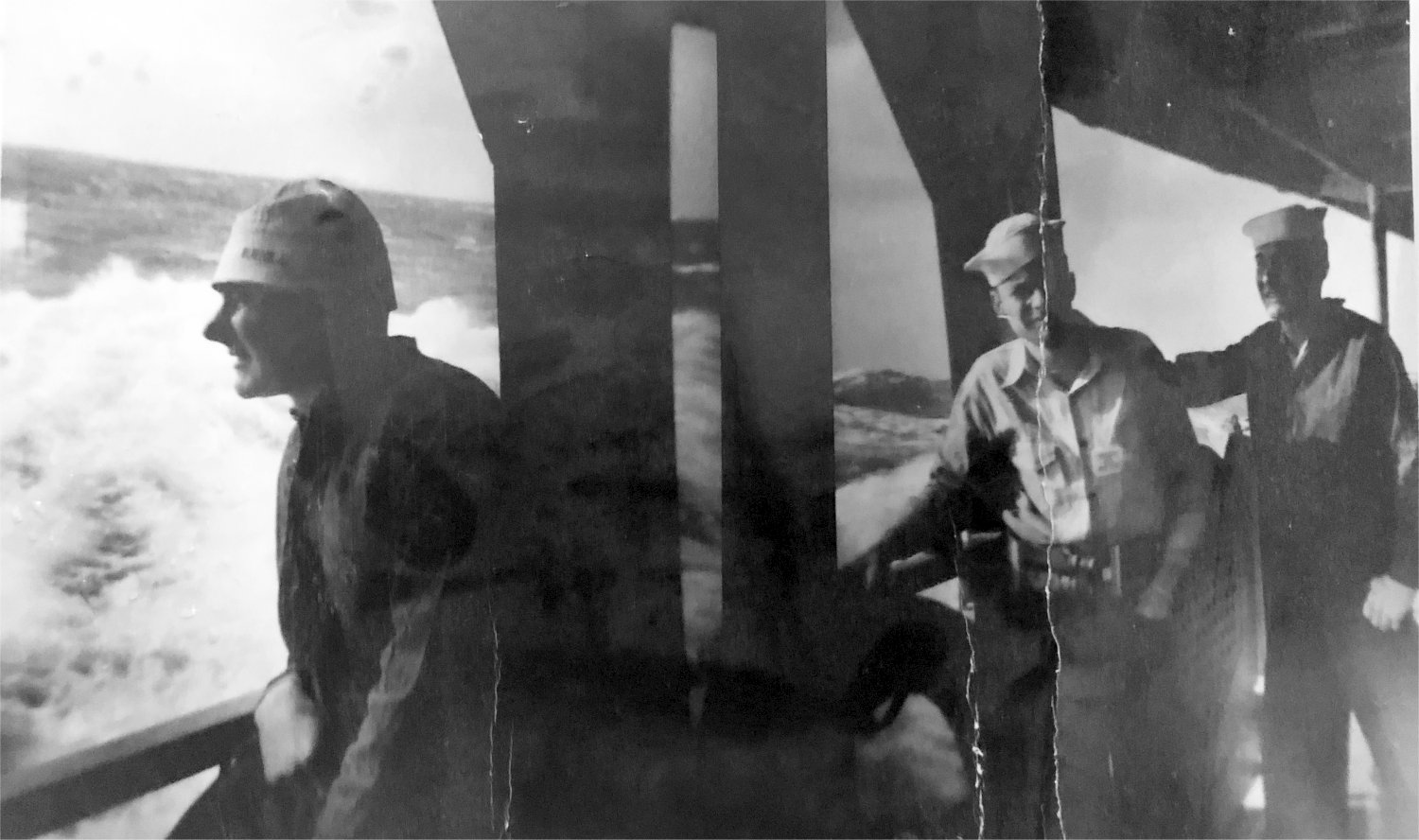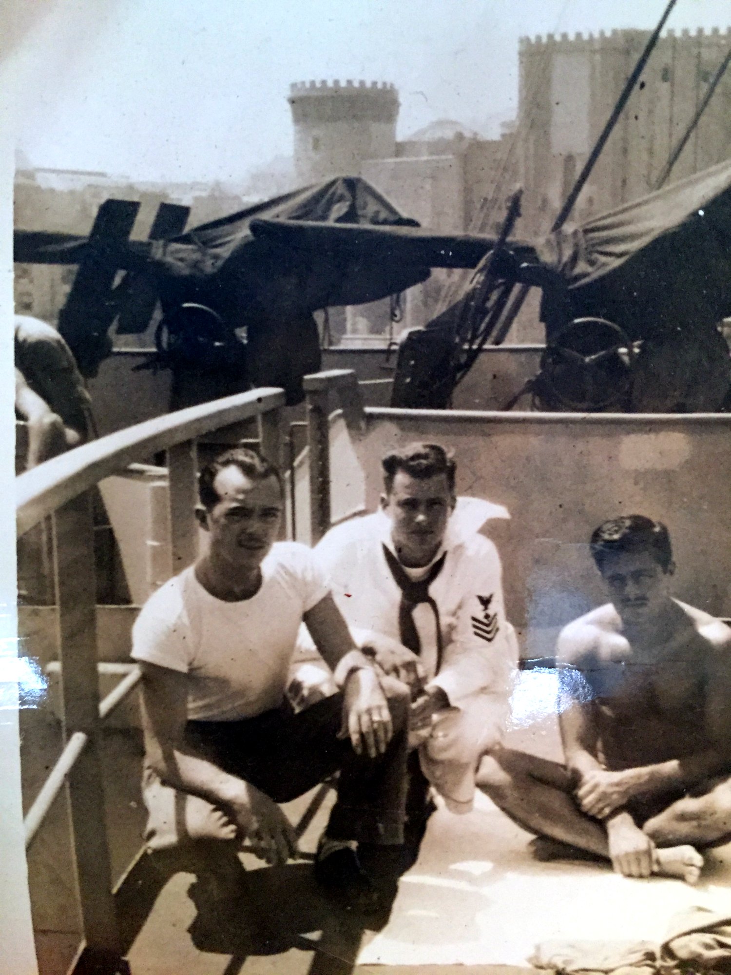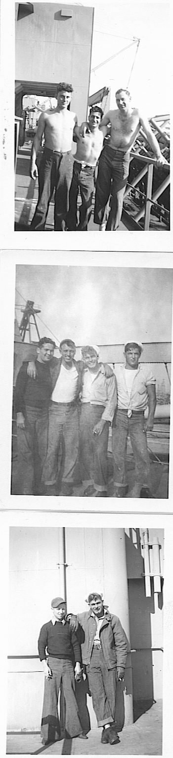Top - Bruce Chaney on the left with shipmates, Middle - John Goen & Tom Price with two shipmates between them, Bottom - Tom Price with shipmate (bell bottom trousers)