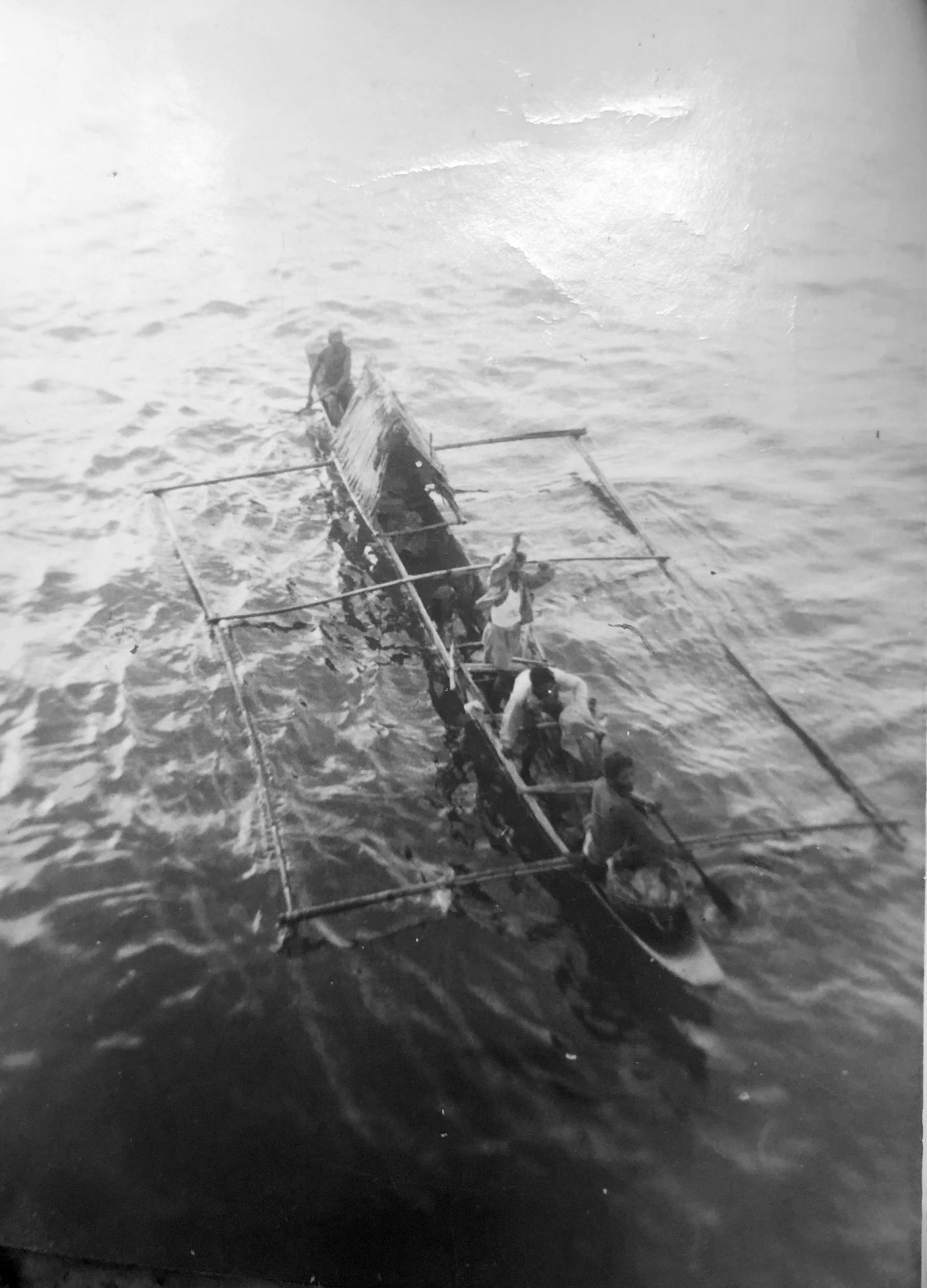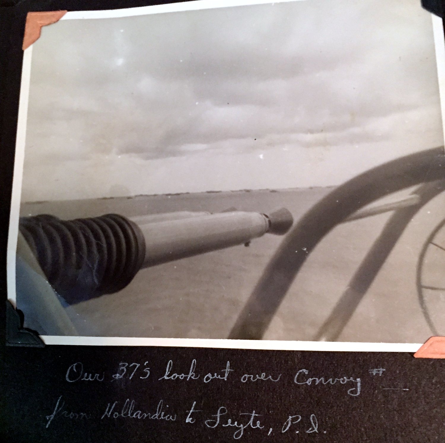 Top Left -Tom Price aboard O.H. Ernst with 40 mm guns, Upper Right - Bruce Chaney & Edward Cates in Yokohama, Japan Lower Left - Hollandia, New Guinea, US Flag at 1/2 staff F.D. Roosevelt's death 12 April 1945, Lower Right - Philippines Islands-enemy prisoners of war on barge