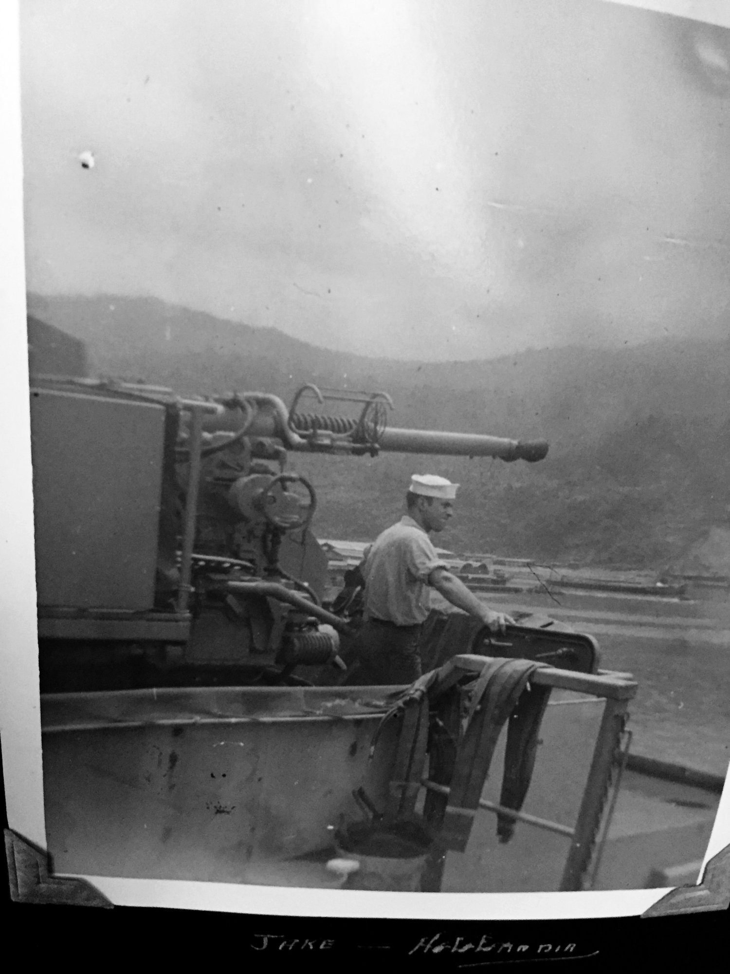 |  Left - Bruce Chaney with two shipmates, notice Bruce's pet monkey on his arm Right - General O. H. Ernst 20mm gun mounts