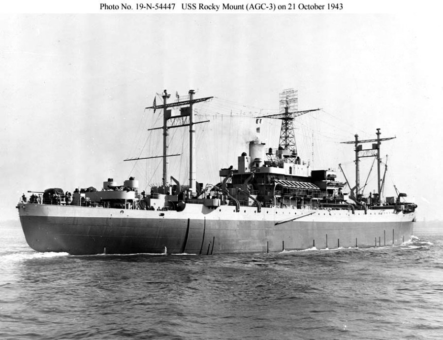 111k | USS Rocky Mount (AGC-3) under way, 23 October 1943. US National Archives photo # RG-19-LCM. Photo # 19-N-54447 a US Navy Bureau of Ships photo now in the collections of the US National Archives, courtesy Shipscribe.com, and US Naval History and Heritage Command photo # NH 107686 |