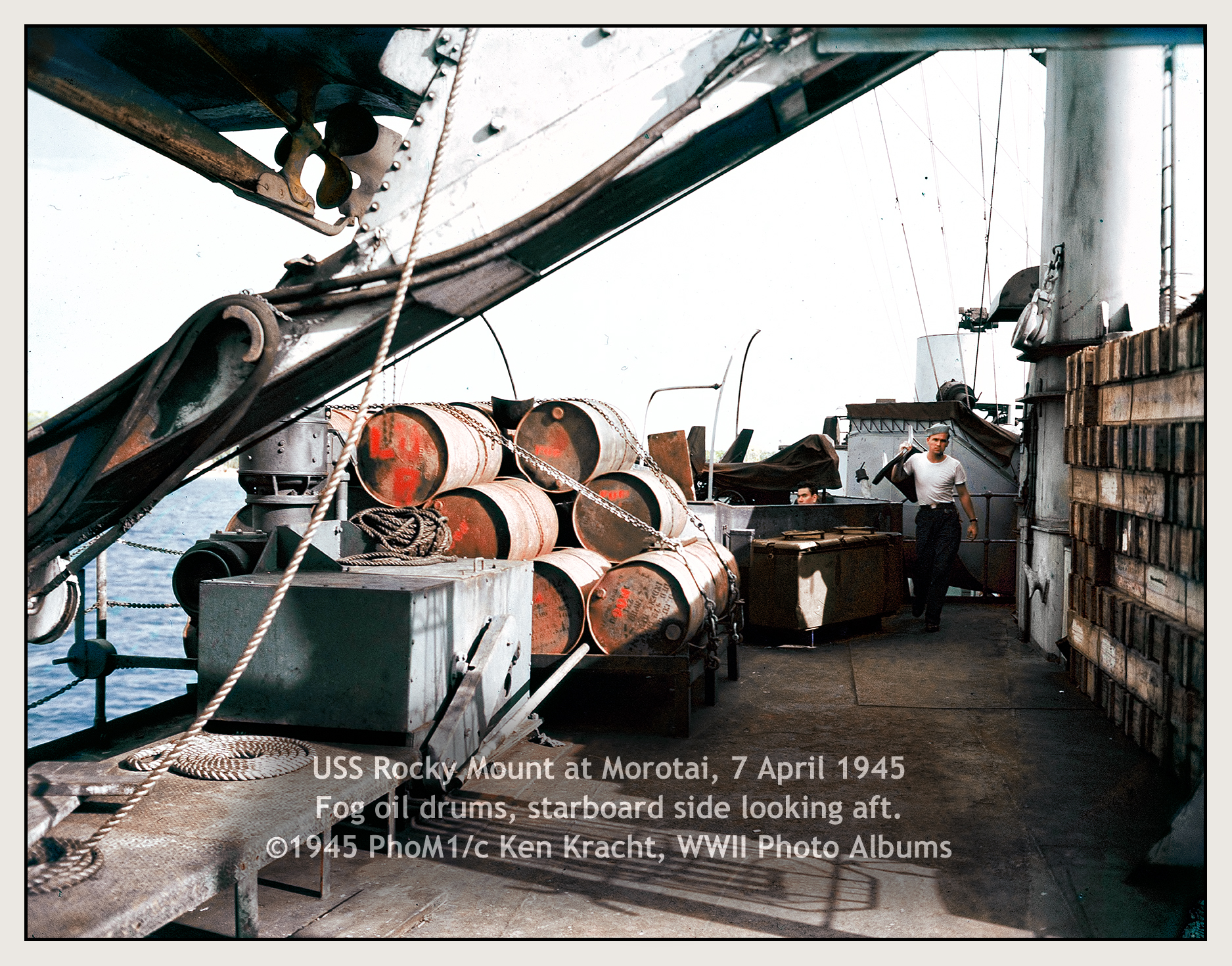 2246k | USS Rocky Mount (AGC-3) fog oil barrels and wooden crates is starboard side aft, looking aft, 01 level. | Carl Kracht for his father PHom1/c Ken Kracht | |