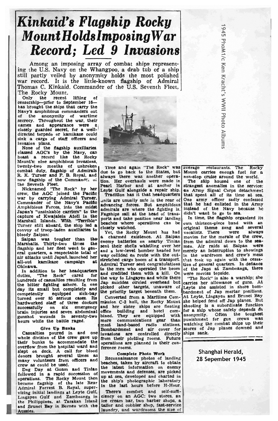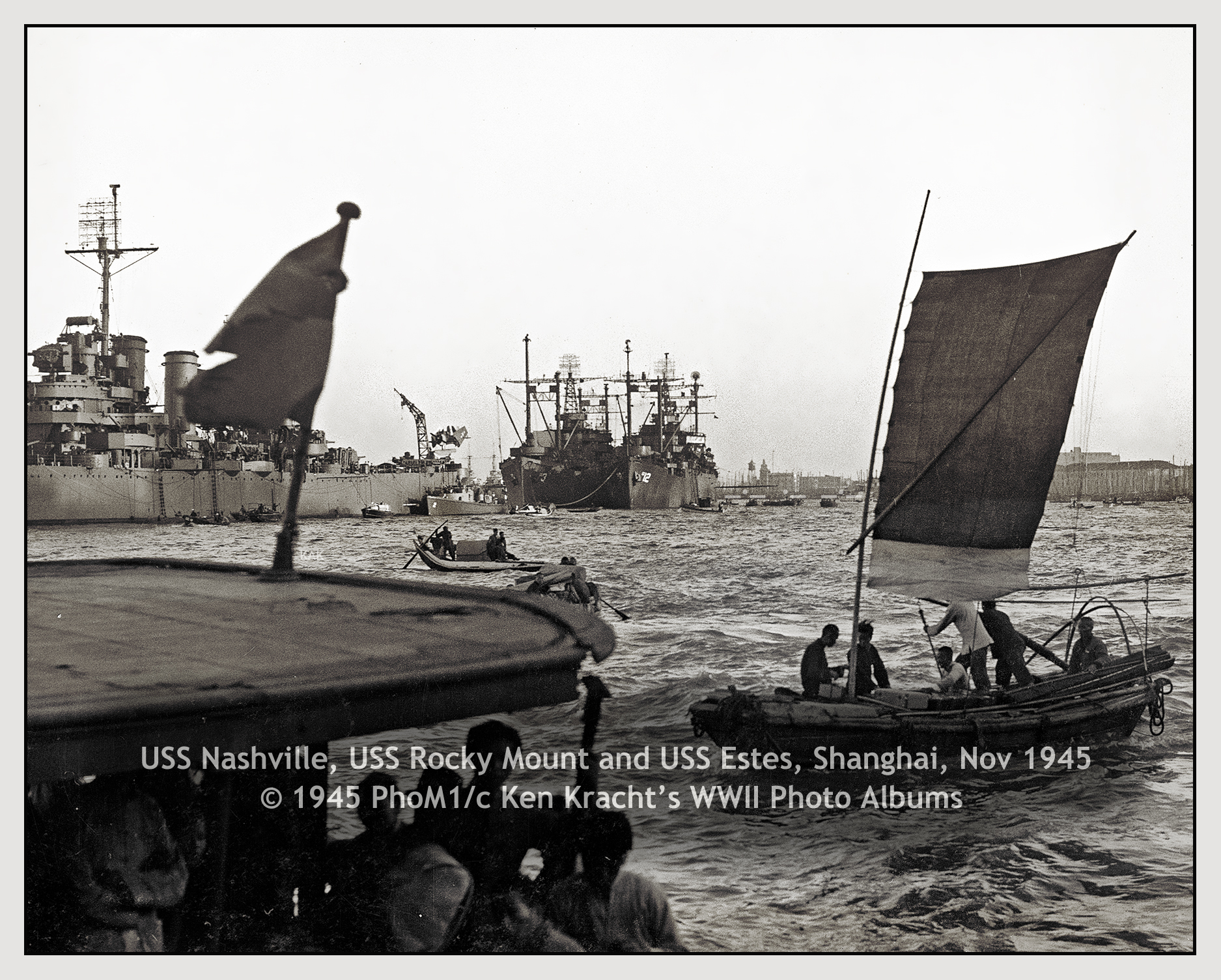 1813k | USS Nashville (CL-43) moored forward of USS Rocky Mount (AGC-3) moored inboard of USS Estes (AGC-12) on the Whangpoo River, at Shanghai, China in November 1945. | Carl Kracht for his father PHom1/c Ken Kracht | |