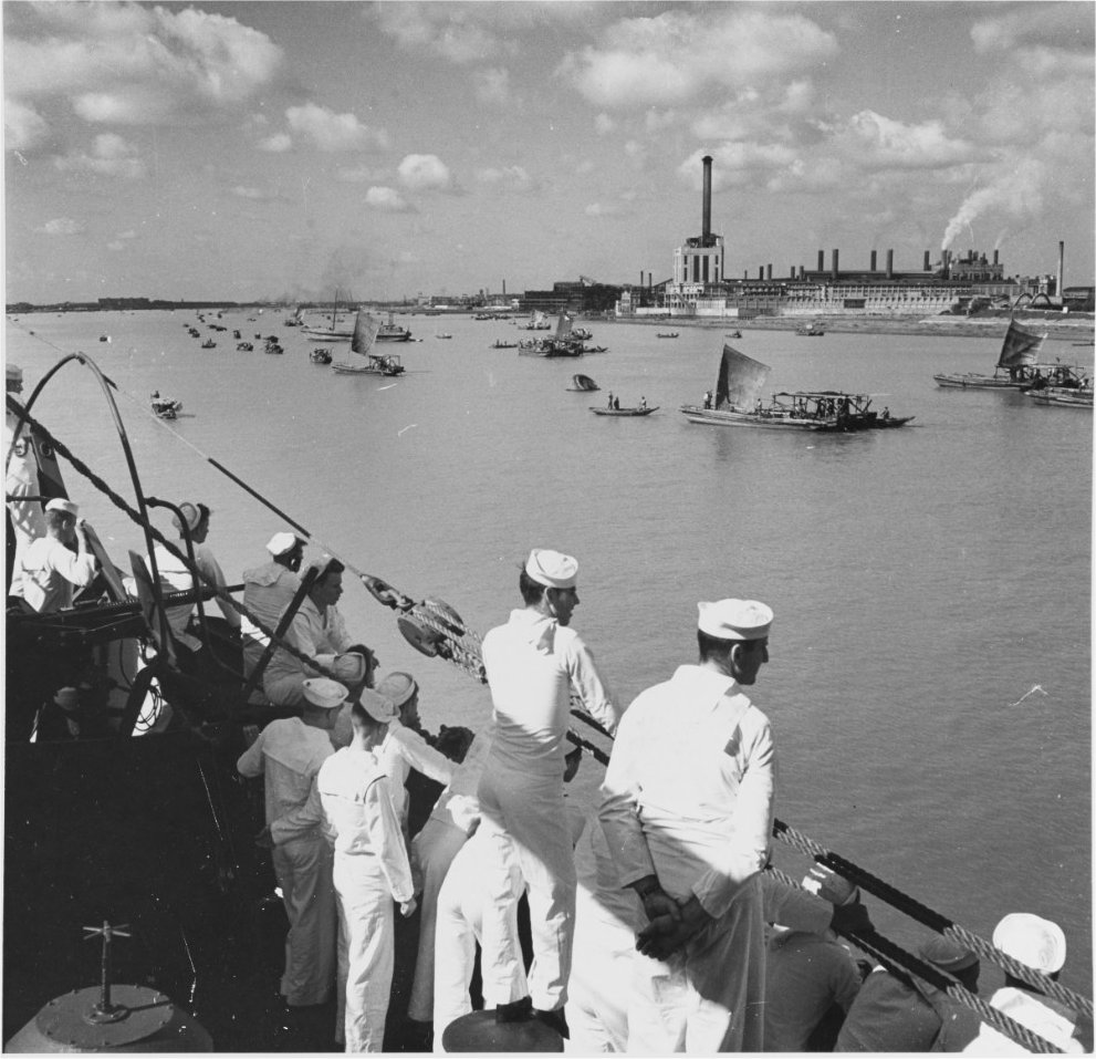 153k | USS Rocky Mount (AGC-3) preparing to moor in the Whangpoo River, Shanghai, China, 19 September 1945.