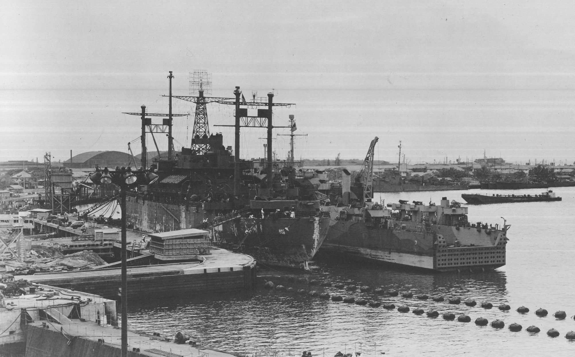 of the former coaling dock at Navy Base Pearl Harbor, 21 March 1944. Rocky Mount was scheduled to start an overhaul the next day and Oak Hill had