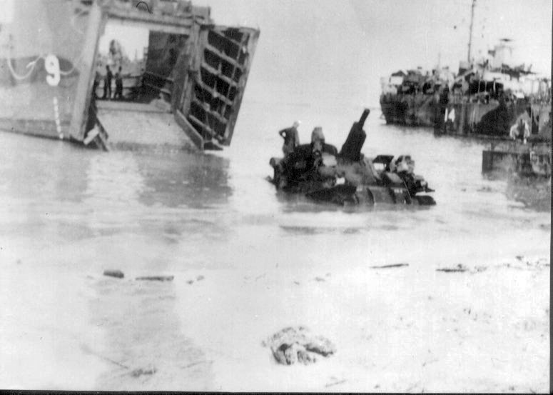 56k | USS LSM-9 beached at Manus, Admiralty Islands, with a non-war casualty, a drowned tank destroyer that didn't make it aboard, loading up for Lingayen Gulf, Christmas Day, 1944. Note the stern of LSM-14 is visible in the background.(See further details under "Personal Narrative.") | Raymond A. Biswanger, Jr., Ph.D., LT. USN Ret. USS LSM-9 | ||