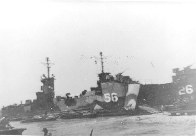 USS LSM-26 and USS LSM-56 beached at Okinawa in April 1945. |